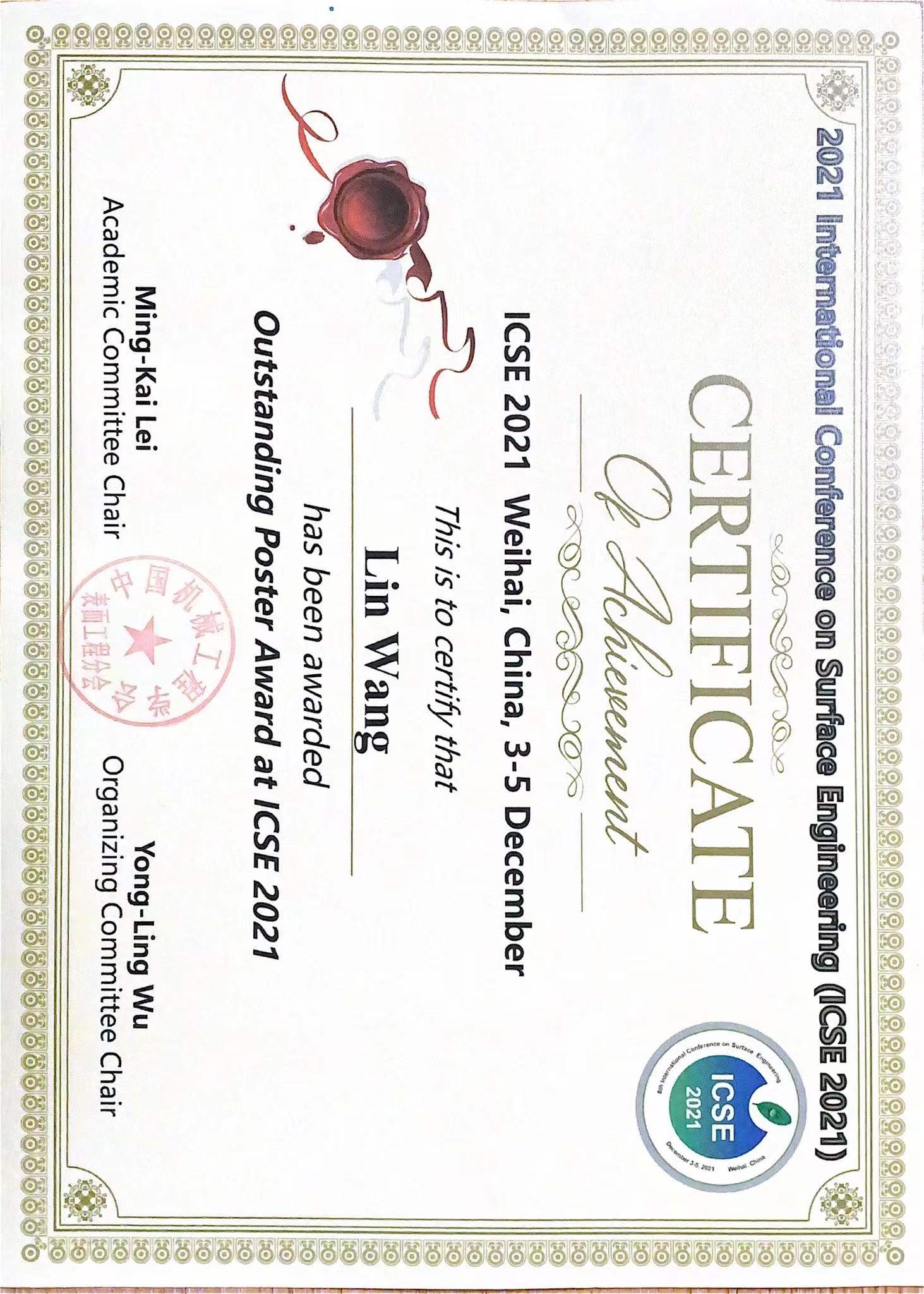 二年级硕士生王琳代表团队做的题目为“Heteroepitaxial Growth Related to Impact Melting and Mechanical Interlocking in Ceramic Metallization Using Cold Spraying”的海报,获大会“杰出海报奖”。