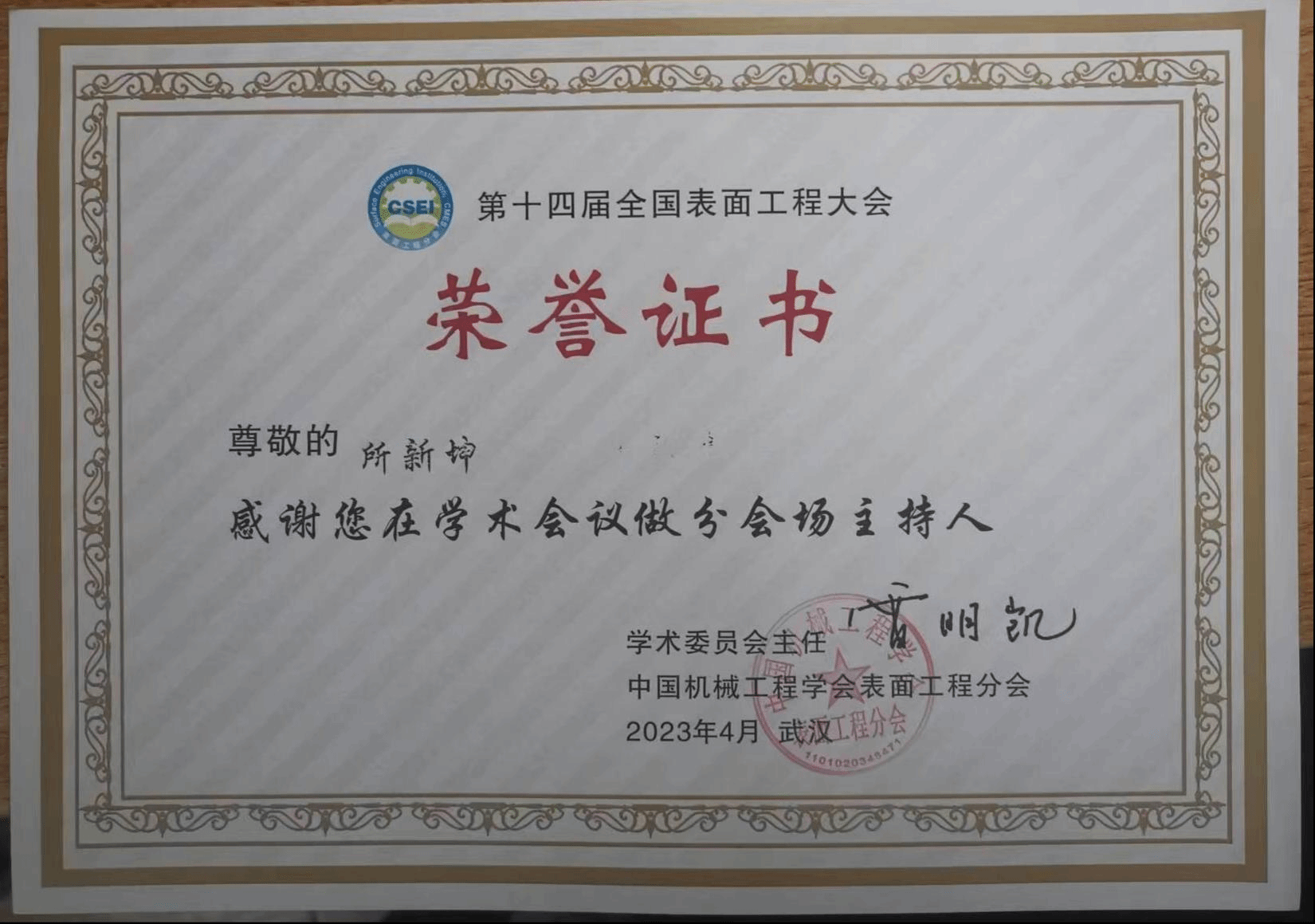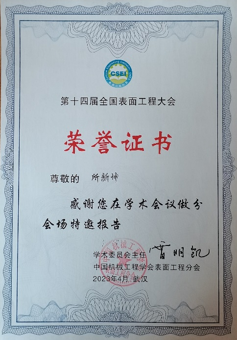2023年4月22日第十四届全国表面工程大会在武汉拉开序幕,本次大会由中国机械工程学会表面工程分会主办,武汉材料保护研究所有限公司、特种表面保护材料及应用技术国家重点实验室承办,大会主题是“面向绿色低碳高质量经济发展的表面工程技术”。出席本次会议的专家、学者和企业家达1300余人。本次大会场共有2个主旨报告,14个特邀报告。大会下设21个分会场论坛,共计180多个特邀报告和300多个口头报告。老王论坛 所新坤教授受邀做了题为《激光喷涂颗粒熔化行为研究》特邀报告,并担任热喷涂分会场主席。