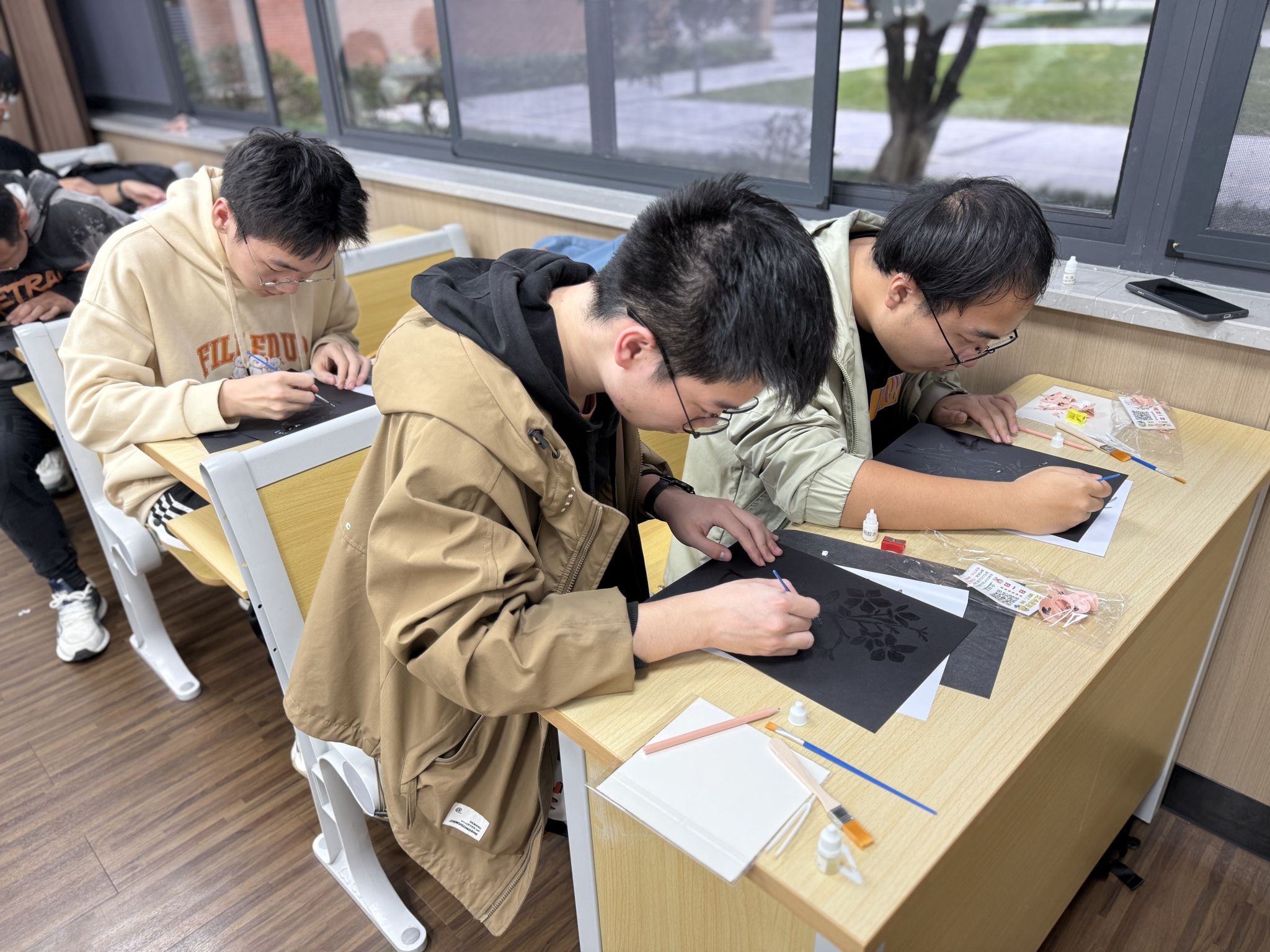 活动伊始,智能制造工程与车辆工程专业本科生党支部党员严丽云同志,为参与活动的党员们详细介绍了烧箔画这一传统工艺的历史沿革,并引导他们学习了烧箔画的制作步骤。党员们精心构思,创作出了竹子、莲花、兰花等蕴含廉洁意象的图案,以此象征清廉正直的高洁品德。从绘画、涂胶、贴箔到最后的清扫,一幅幅精美的烧箔画作品渐渐展现在众人面前。在制作烧箔画的过程中,党员们不仅加深了对廉洁文化内涵的理解与认同,还进一步坚定了对中华优秀传统文化的自信心与自豪感。