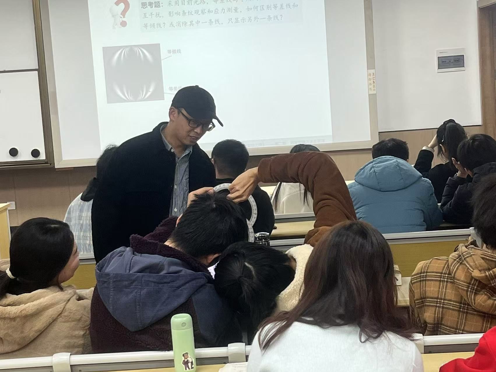 李科斌老师以生活中眼镜镜片的应力观测为引,激发学生对可视化应力测量的学习兴趣和对力学的学科情感,之后依次讲解了光弹测量的光学基本知识、平面应力-光学定律和光弹性实验装置等教学内容,在介绍光弹法的发展历程时,李科斌老师以实验力学奠基人贾有权先生和结构疲劳专家高镇同院士的人生经历为例,引导学生学习老一辈力学家们的教育家精神和科学家精神。授课过程中,李老师积极与学生互动,调动学生的学习热情,引导同学们对课程内容积极思考。课程最后,李老师对同学提出的问题做了解答。