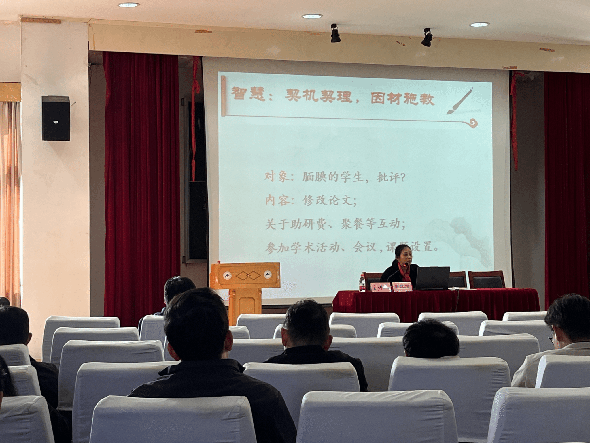 在绣山楼三楼报告厅举办了2024年研究生导师专题培训活动。本次培训邀请到陈江瑛教授作为主讲人,学院党委书记王智腾、副院长彭文飞、副书记沈妍伶及学院研究生导师参加了本次培训。