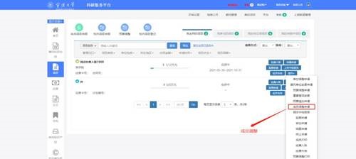 4. 进入项目组成员,请确认成员是否完整。特别是项目中有学生的参与的,请完善学生身份类别。成员信息有问题的,进入科研系统主页 ,左侧的项目界面,点击操作下拉框下的成员调整申请,进入成员调整界面进行添加和修改,待项目主管审核之后,会自动补充到项目经费公开一览表,最后再提交即可。