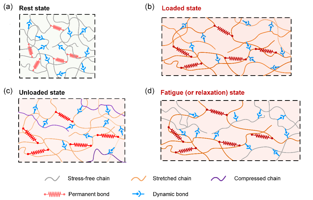 具有动态交联网络结构的水凝胶、弹性体在近年来得到了快速发展,由于动态交联的快速可逆重连,这类材料具有自修复、力学性能可调控等特点,在强韧化、功能化方面有独特的优势。具有动态交联网络结构的软材料在功能化、器件化应用过程中,往往经历多次往复变形,如何有效描述该类材料在循环变形中的微观构象演化及其宏观力学行为变化,对于材料的结构化设计和器件化应用具有重要意义。