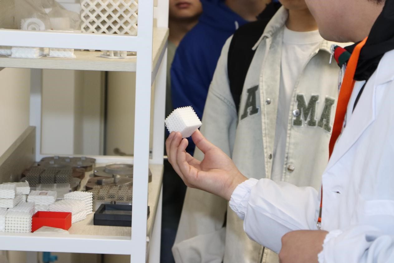紧接着在实验室里讲解员向大家展示了非常有趣的3D打印,一句“利用我们3D打印技术,可以做出很多神奇的、一般技术不能做到的结构”,引来同学们的目光,有的同学拿起打印好的立方体、缩小版埃菲尔铁塔,有的同学驻足观看机器如蚕食般吐丝打印,甚是有趣。