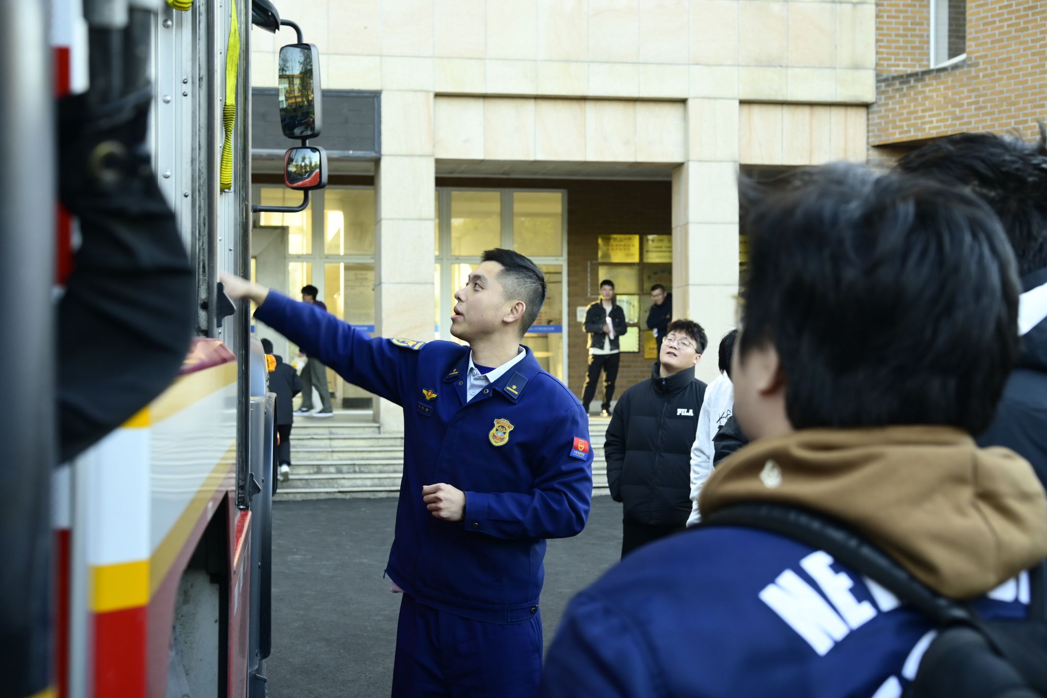 随后,师生们来到学院门前的消防车前,开启了一场“沉浸式”装备探索之旅。副站长打开消防车侧门,逐层展示水带、破拆工具、急救包等器材,并重点介绍了机械臂的液压驱动原理与高空救援应用场景。面对学生们的连环提问,他耐心解答:“机械臂通过液压系统实现精准操控,最大举升高度可达50米”“专业消防衣采用防火隔热材料,但重量超过20公斤,需要团队协作快速穿戴”。当被问及家庭防火要点时,泮站长特别提醒:“厨房用火不离人、手机充电器睡前拔除、阳台不堆放杂物,这三条能规避80%的居家火灾风险。”