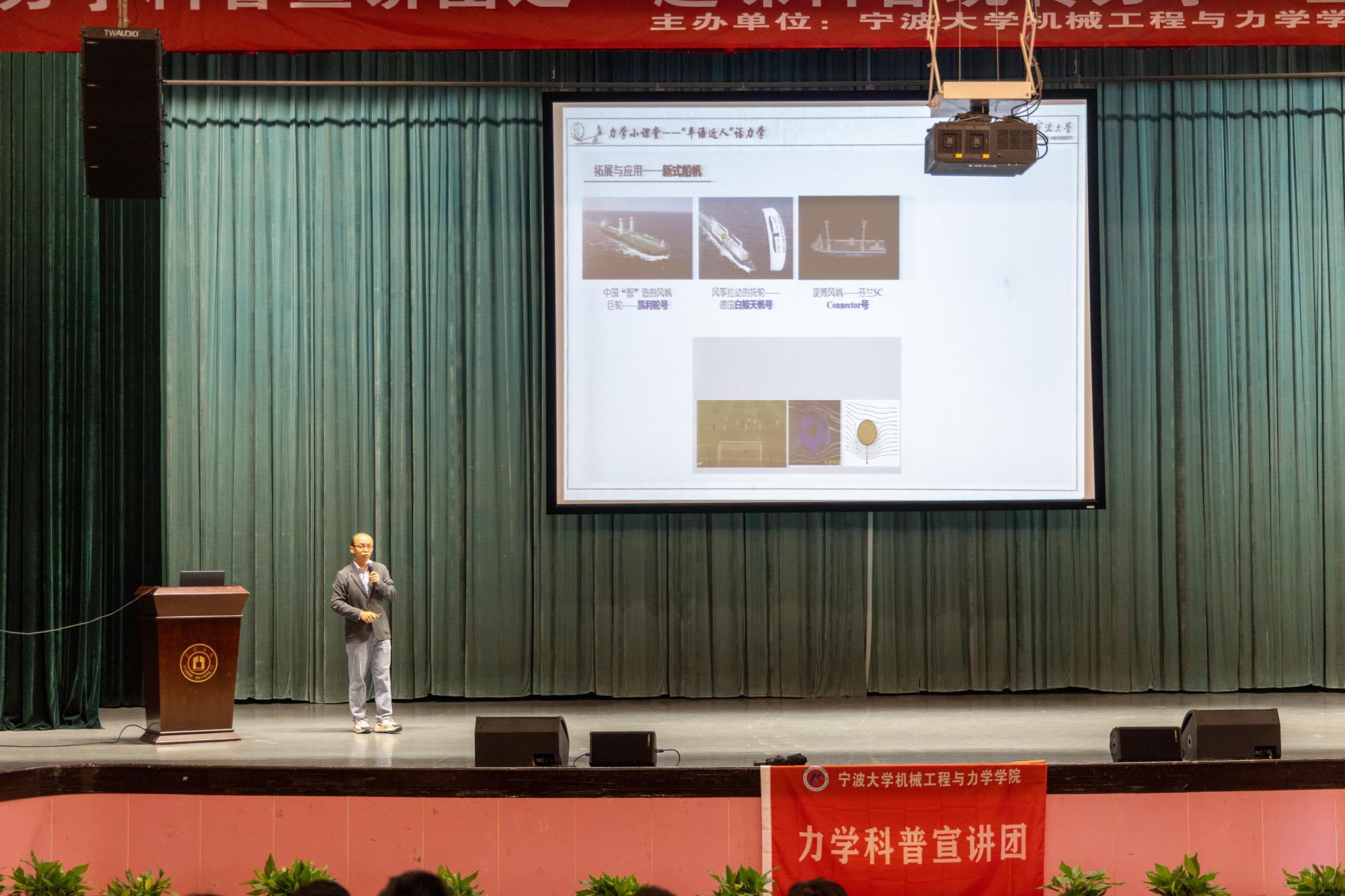“平语近人”,共话力学。力学科普宣讲团指导老师李科斌,讲解了习近平总书记语录中诗词典故背后隐藏的力学原理,拓展及应用。“云帆若鸟飞”,千帆竞发,形如鸟翅,由于风帆的外形具有像鸟翼一样的弧形,帆船的推进原理又与鸟类的飞行原理基本相似;“倏忽南与北”,逆水行舟,倏忽南北,便是帆船逆风行驶时“之”字路线的由来。李老师以帆为引,寄语同学们,“人生如同行船,不可能总是一帆风顺,每个人都难免会遭遇逆境。在逆境面前,我们千万不要失去斗志,而是应该调整姿态,换个角度,逆风而行,同样可以到达理想彼岸。”
