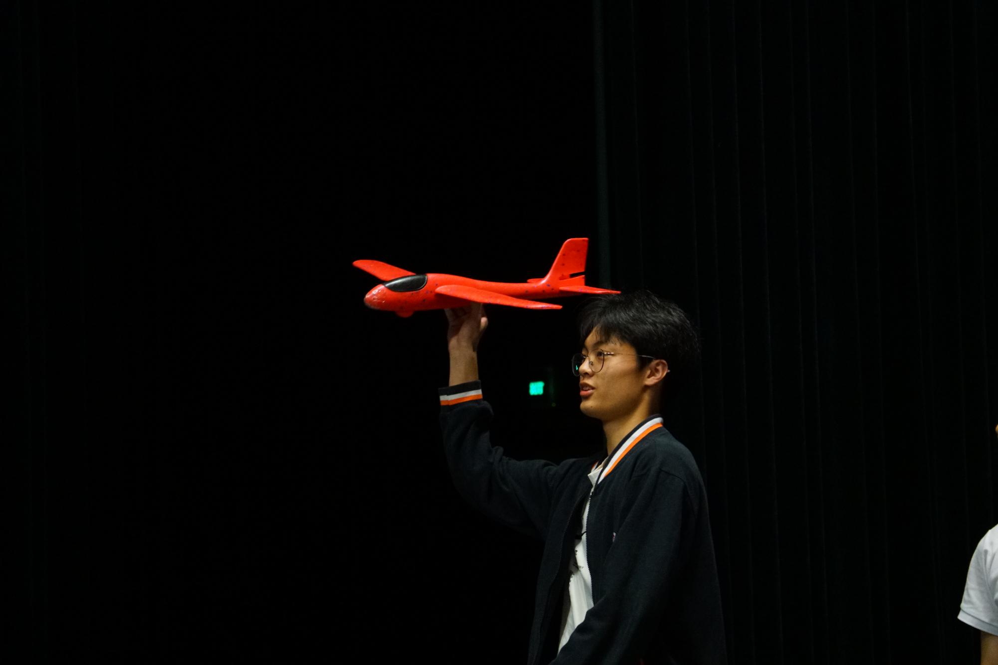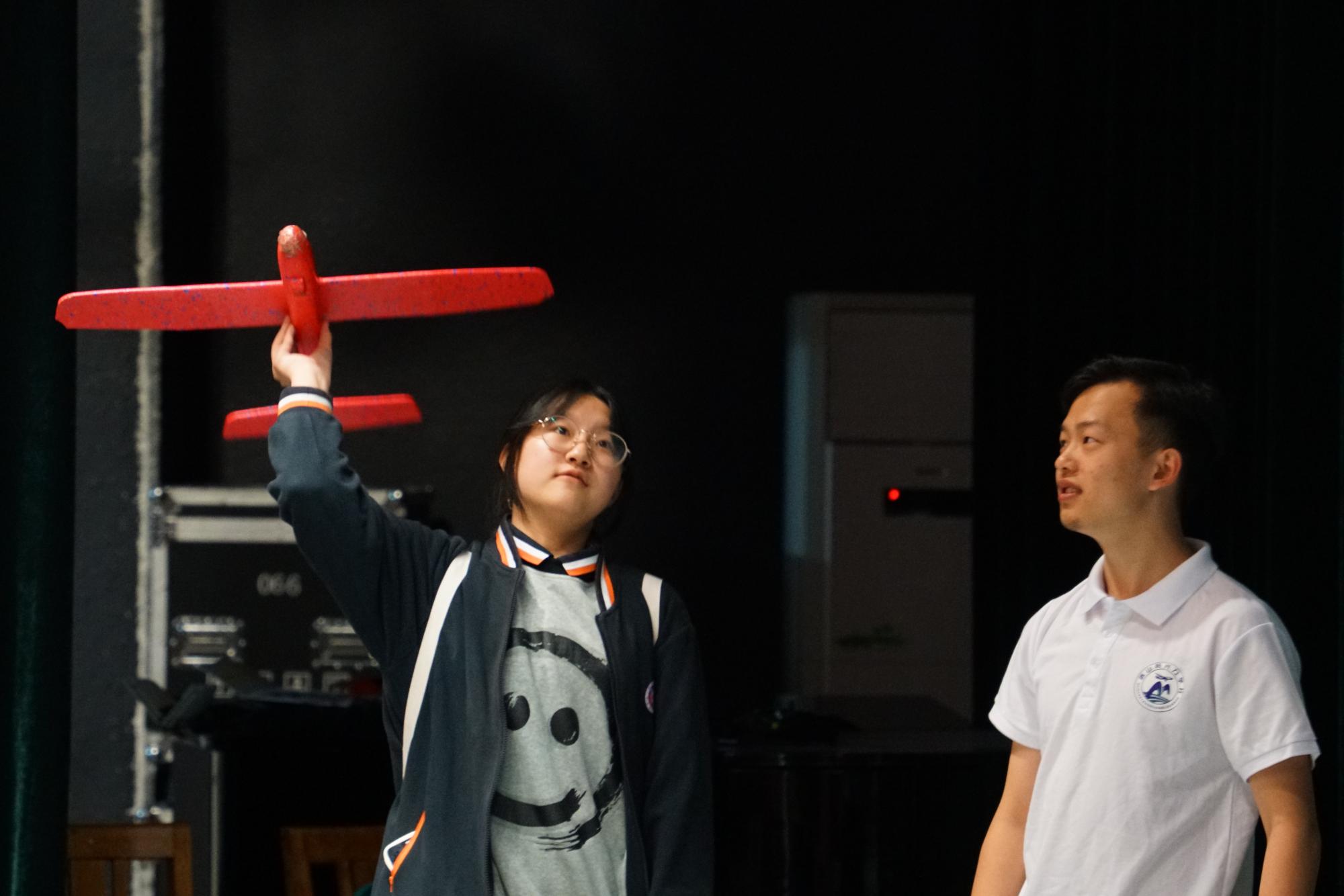 力学为伴,筑梦未来。绣山阳光力学社社长汤寻分享了社团从去年建成至今的故事,现场进行飞行手抛式滑翔机飞行控制展示,并邀请秀州中学的同学们上台试飞,从飞行角度、飞行速度进行指导,气氛活跃,同学们踊跃报名。社团成员倪方坤带来了《被中香炉背后的力学》小课堂,从历史记载、原理及应用展开介绍,并激励同学们要勤思考,将理论与实践结合起来。