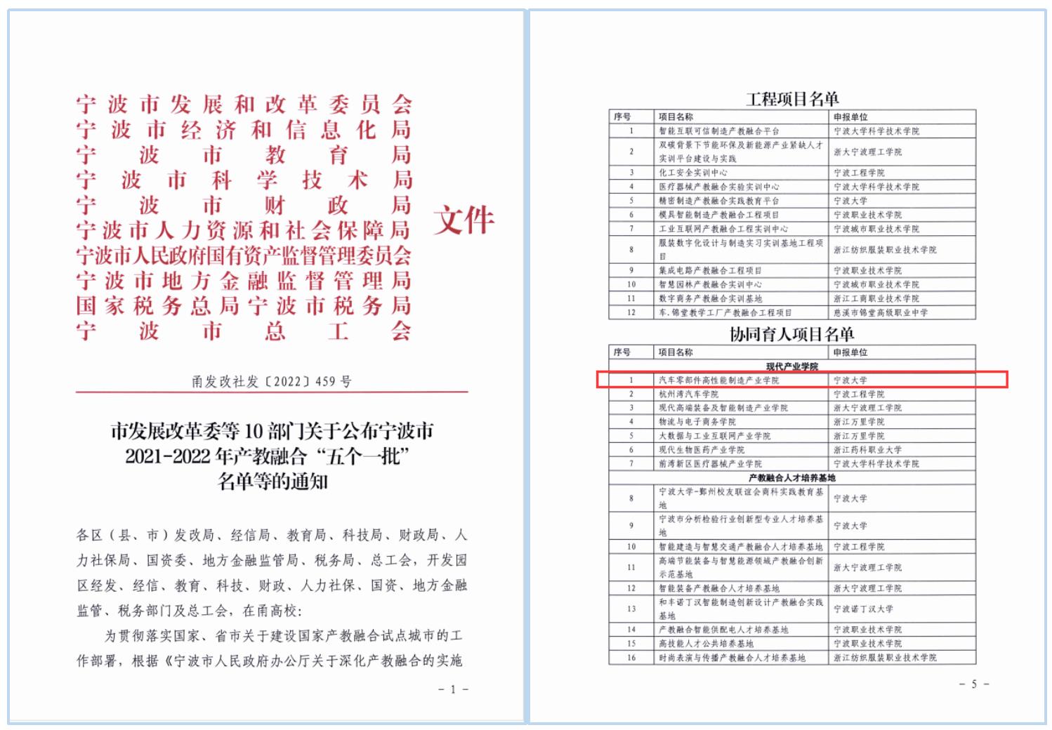 宁波市产教融合“五个一批”现代产业学院立项文件
