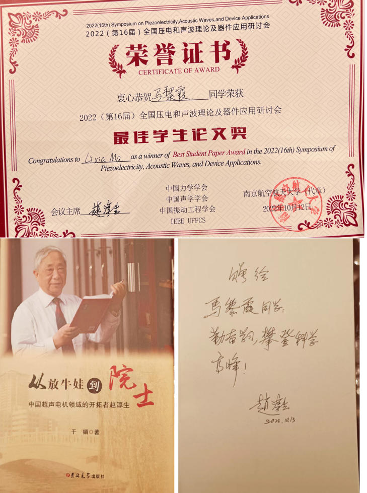 力学系压电实验室的多名老师和学生就自己在压电和声波技术相关的最新工作进展,全文投稿参加了本次会议,并进行了报告。其中工程力学拔尖人才创新班本科生马黎霞同学获大会“最佳学生论文奖”(全国仅6个),是唯一获奖的本科生,并在会后获赵淳生院士赠书。此外,6位获奖学生中的四川大学硕士生楼旭辉同学,为老王论坛