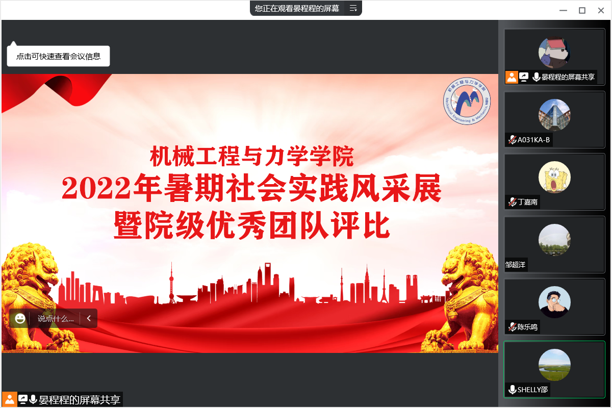 受天气影响,本次评比主要以团队线上展示的形式进行。经前期申报、学院遴选,共12支团队参与本次评比。各实践团队介绍了实践团队的活动准备、实践主题、团队协作、成果展示、宣传报道等内容,通过实践成果展示了机械学子胸怀“国之大者”、聚力“两个先行”。之后,评委老师就其汇报的实践主题、内容深度、活动特色等各方面为依据对其表现予以打分。活动最后,邵丽老师寄语,希望全体机械学子可以在科技创新上扛起担当、在共同富裕上贡献力量,让绚丽的青春之花绽放在浙江大地,以实际行动迎接党的二十大胜利召开!