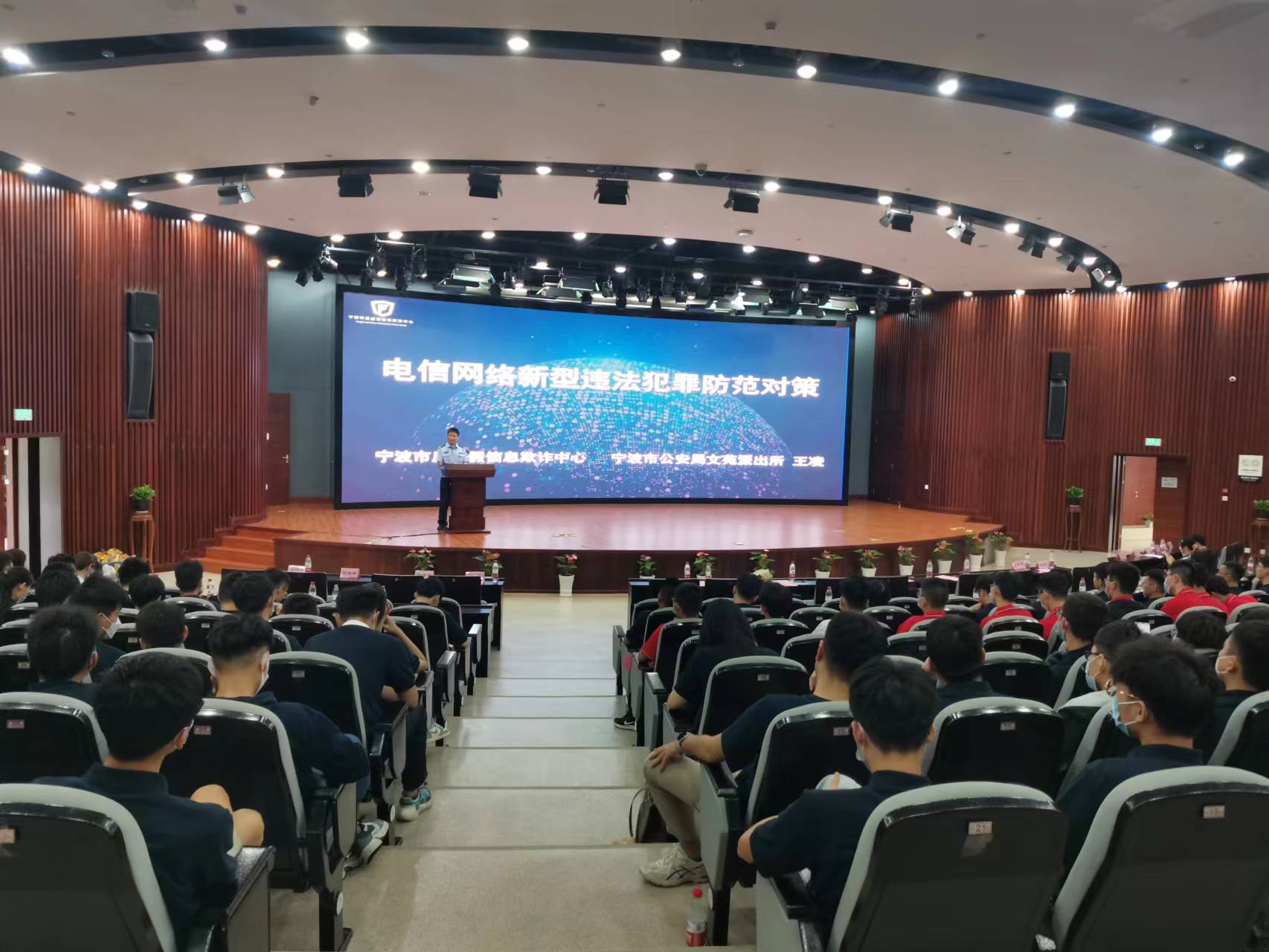 本次讲座,由宁波市公安局江北分局文苑派出所民警王凌警官主讲。作为宁波市反虚假信息欺诈中心成员,王警官从全市的诈骗案发案情况到老王论坛
