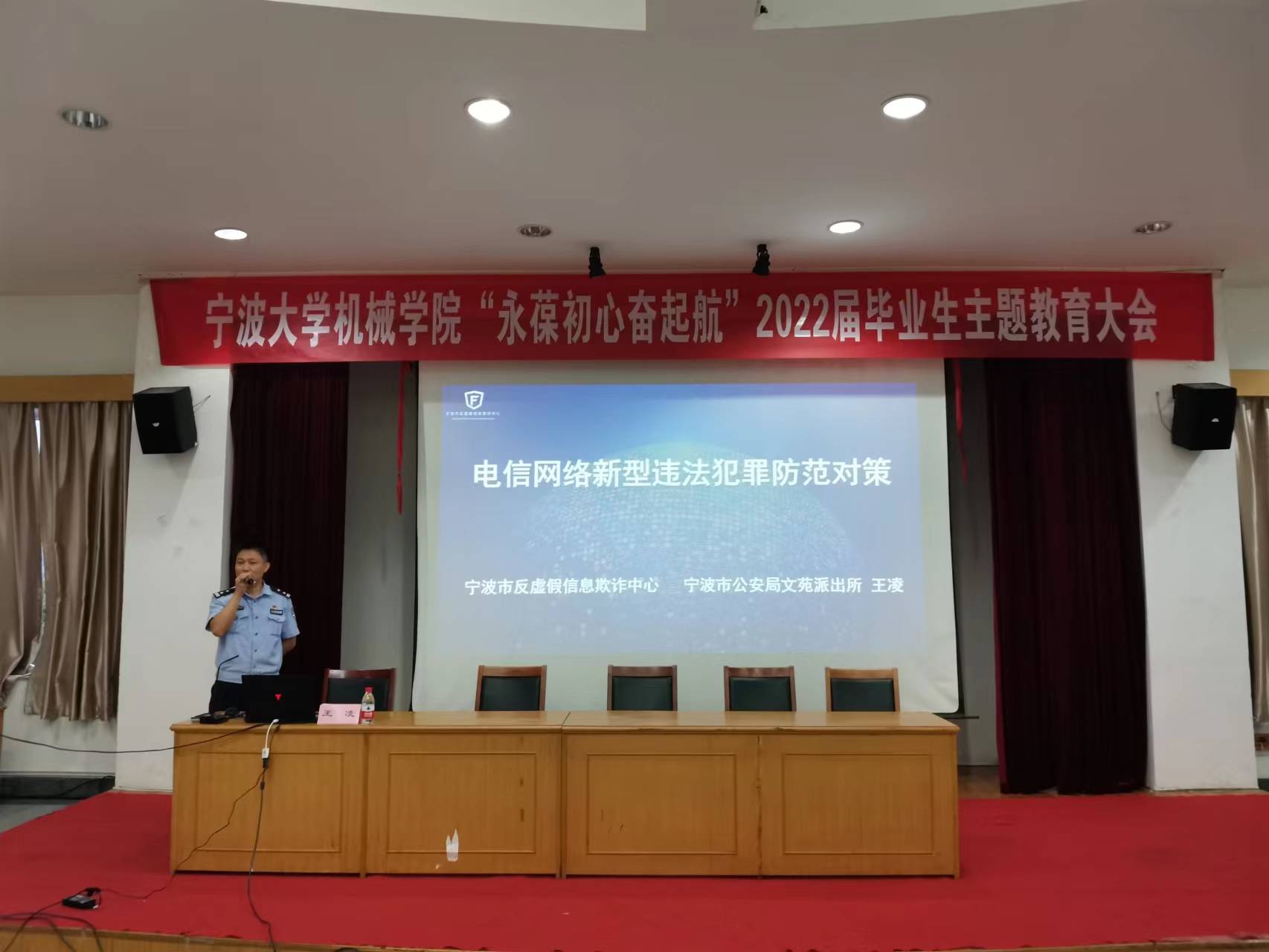 活动伊始,学院特邀文苑派出所王凌警官作主题为《电信网络新型违法犯罪防范对策》的反诈专题教育。王警官简要介绍了常见的诈骗犯罪类型和工具,并用真实案例分析了易受骗群体,提醒大家要提高警惕,谨防诈骗。为进一步加强毕业生安全法治和廉洁纪律教育工作,现场特聘王凌警官为学院校外思政导师,与会师生共同观看廉洁从业宣传片。与此同时,现场全体毕业生党员举行“强国有我”宣誓活动,用铿锵誓言彰显宁大毕业生为民族复兴矢志奋斗的青春风采。大会期间,学院相关辅导员还围绕党团组织关系转接、户口迁移、就业派遣、毕业典礼注意事项等事宜进行了详细说明。
