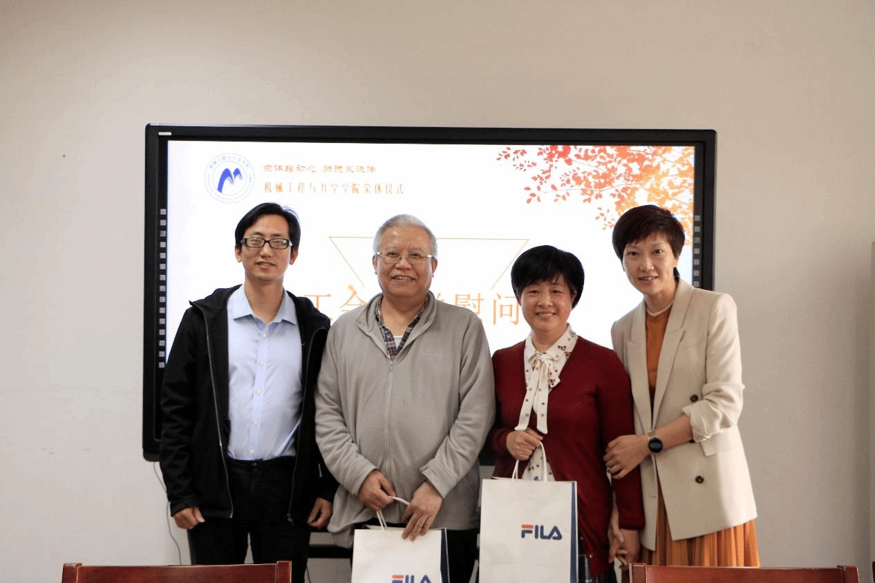 最后,学院领导、分工会领导分别向两位教师赠送了纪念品和慰问品,所有老师在绣山工程楼前合影留念。