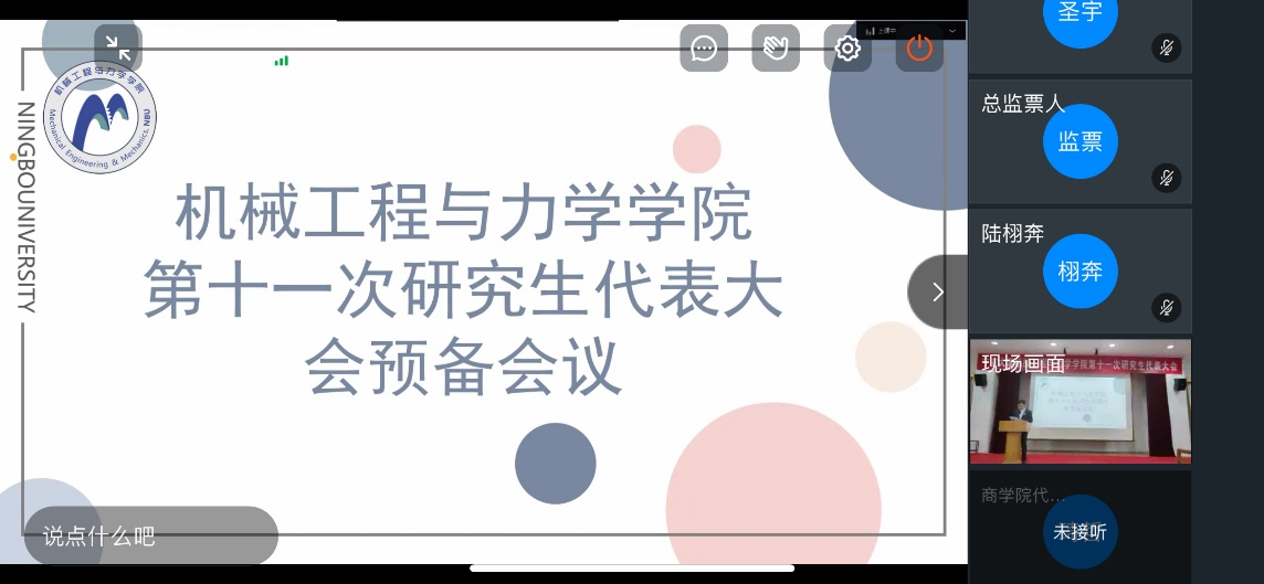 第十一次研究生代表大会于绣山工程楼三楼报告厅隆重召开。学院学工办/研工办主任洪松、团委书记褚慧丽、研究生辅导员潘晶婧,校研会代表曹越同学以及研究生各班代表参加本次大会。由于疫情影响,本次大会采取线上与线下结合的形式。本次大会听取并表决了第十届研究生会工作报告,并选举产生了第十一届研究生委员会委员。