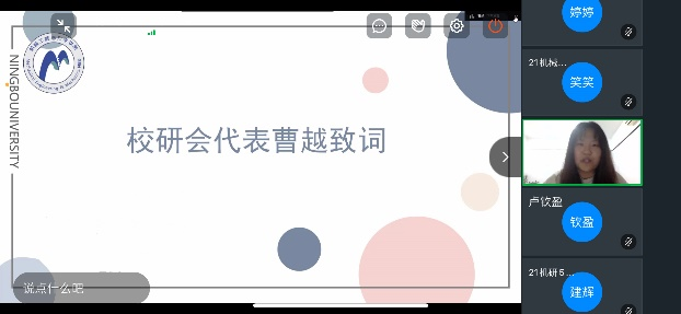 由于疫情影响,邀请团委书记褚慧丽线上发表讲话,褚书记对研会、研会成员以及全体研究生同学提出几点希望,她要求研究生会要找准组织定位,明确组织职能;全体研究生同学既要着眼当下,又要目光长远,积极应对未来的各种挑战。校研会代表曹越同学线上发表讲话并对本次大会顺利召开表示祝贺。