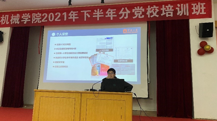 接着,来自2018级的吴兆波主要向同学们讲解了他的入党历程和成为党员后给自己带来的改变。他从自己在入党过程中的一篇《陌上石榴花开》展开,结合自己在疫情防控期间的志愿服务工作,跟大家分享了他的座右铭:锤子敲打的力量+镰刀收割的希望=旗帜飘扬的辉煌。分享过程中,吴兆波同学也希望大家能平衡好生活和学业,学习身边榜样,争做模范先锋,传播正能量,成为于党于国于家奋发有为的新青年。