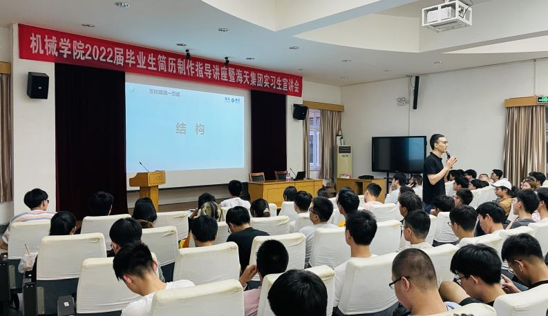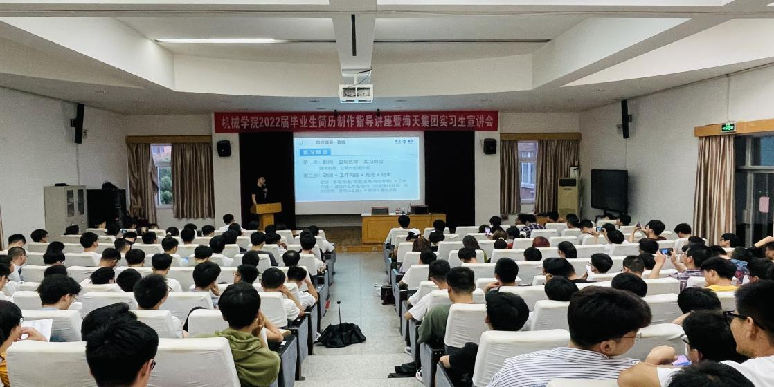 于绣山工程楼三楼报告厅举行2022届毕业生简历制作指导讲座暨海天集团实习生宣讲会,2022届毕业生近180余人参加。