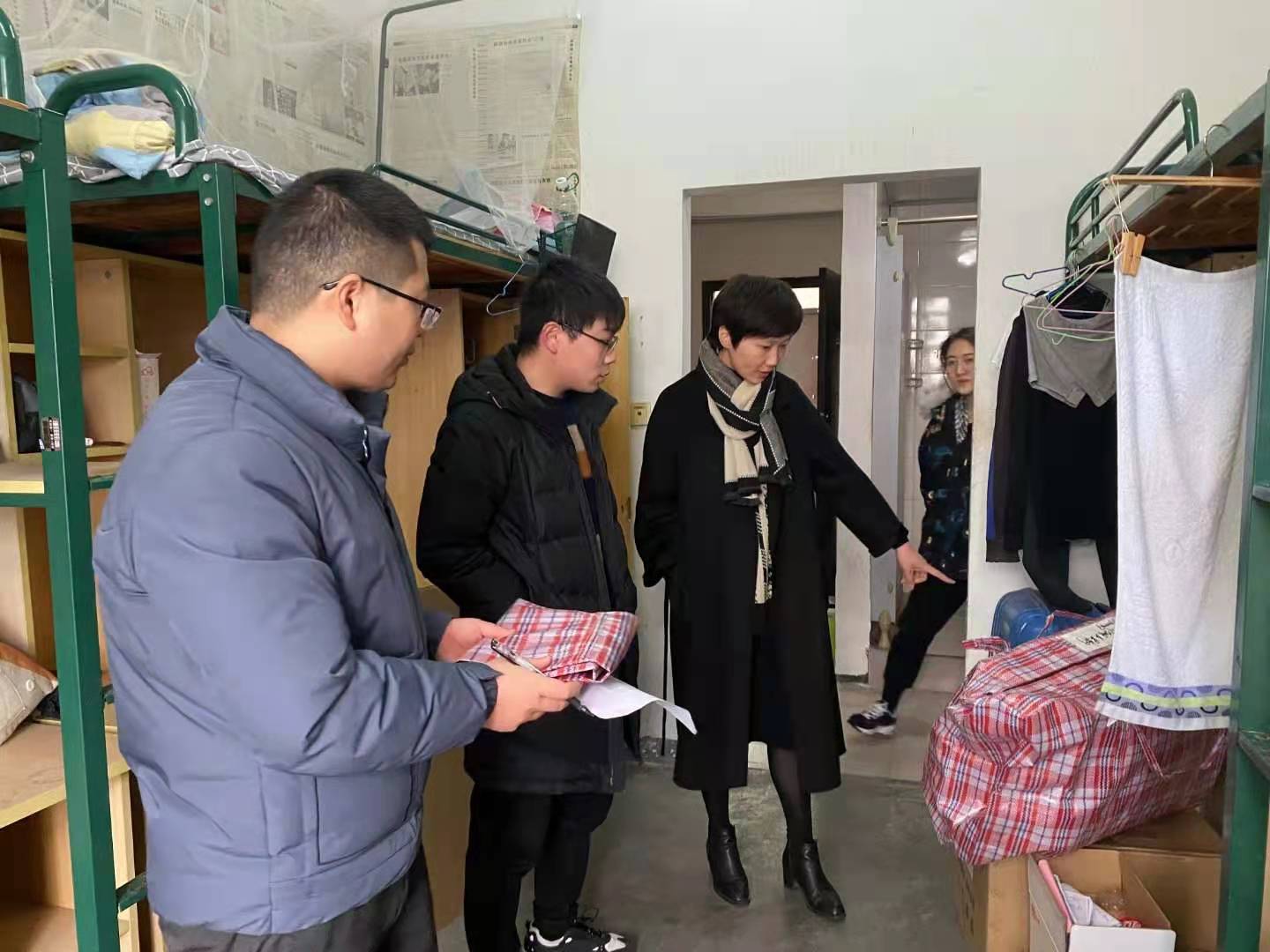 1月22日上午,学院党委副书记邵丽和学工老师们进行了南门寝室的走访慰问。在走访中,邵丽老师亲切地与学生交谈,提醒她们要趁这次搬迁机会断舍离,做好个人物品的整理和收纳。