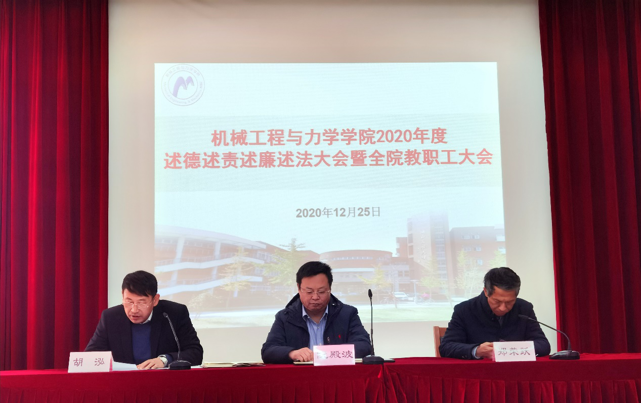 2020年度述德述责述廉述法大会暨全院教职工大会在绣山工程大楼三楼报告厅召开,学院党政领导和全体教职工参加了会议。会议由党委书记胡泓主持。