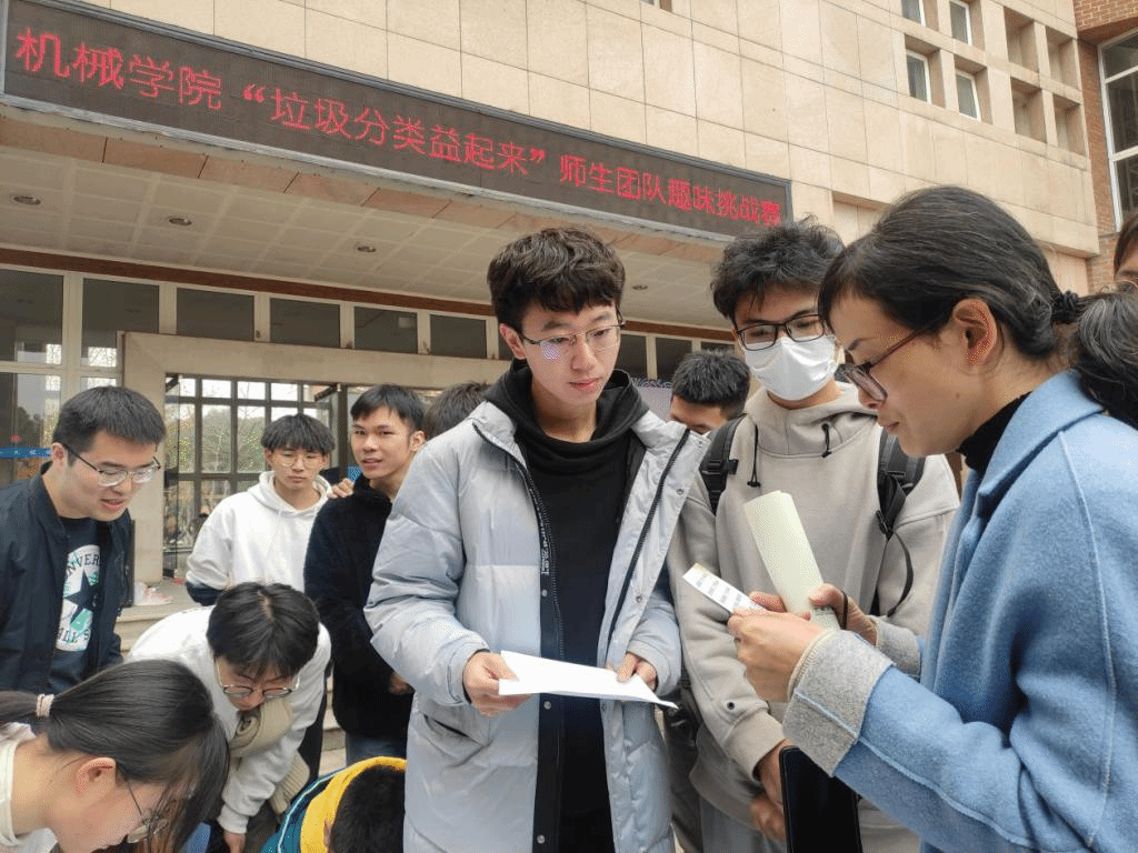 在绣山工程楼前的小操场,举办了一场别出新意的垃圾分类趣味挑战赛。