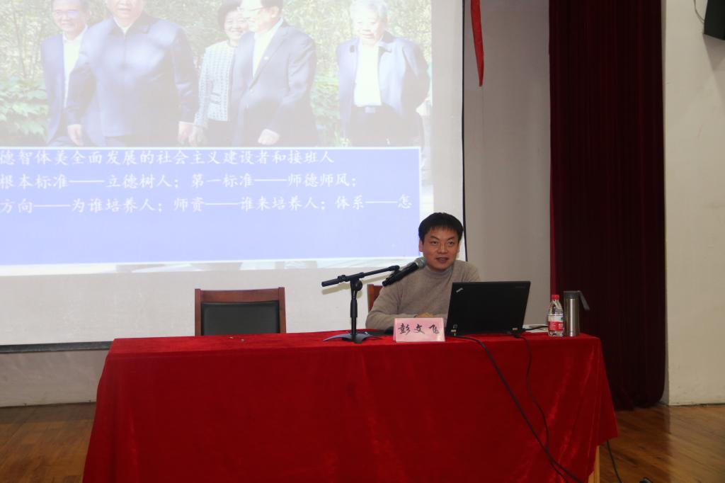 彭文飞副院长以党章内容为基准,立足“两个大局”,结合习近平总书记在全国教育大会、全国思政工作会议和五四青年节期间对青年的寄语等重要讲话内容,围绕习总书记对教育的系列重要论述,以鲜活的事例为例,分享了在京学习的体会,鲜明阐释起“培养什么人、怎样培养人、为谁培养人”这一教育根本问题,详细介绍了“一个根本、两个大讲、三个地位、四个主体、五人目标、六个下功夫、七个第一、八个学会、九个坚持”等九块内容。