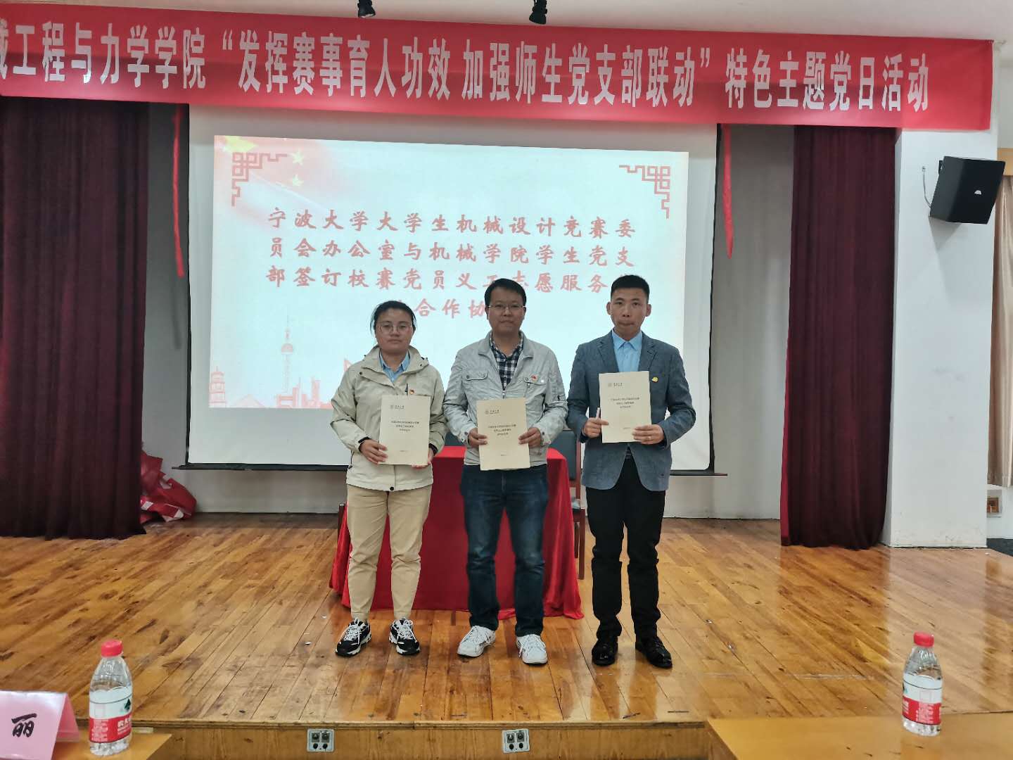 大学生机械设计竞赛党员义工服务基地的签订仪式。与会领导向今年前往四川、广东和黑龙江三省参加国赛的5支国赛决赛团队授予院旗。