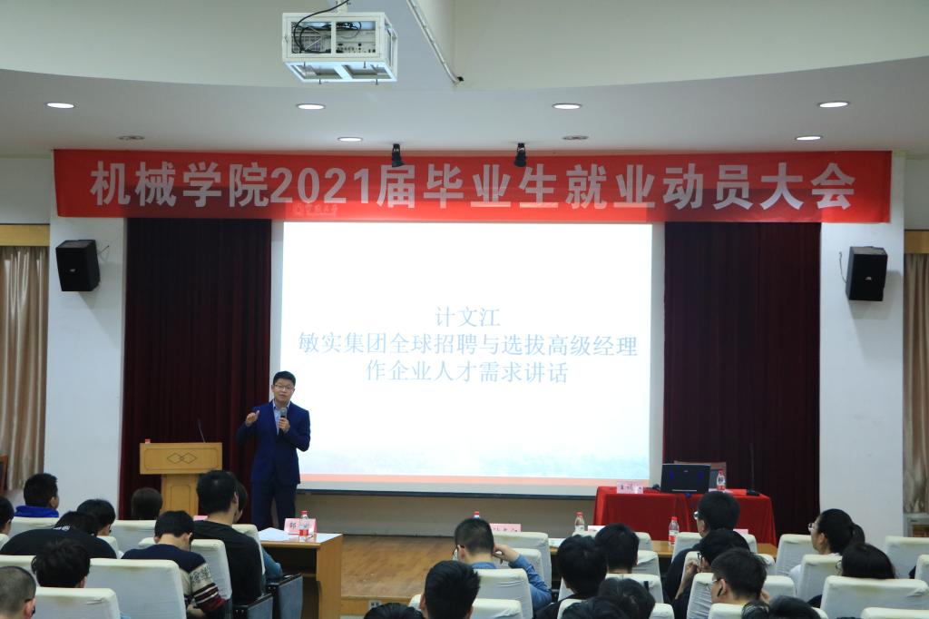 就业指导中心主任王洪影、敏实集团全球招聘与选拔高级经理计文江作为主讲嘉宾,学院党委副书记邵丽、2021届毕业班班主任项四通、鲁思渊、汪小峰等出席。会议由学院就业指导中心主任张万兵主持。