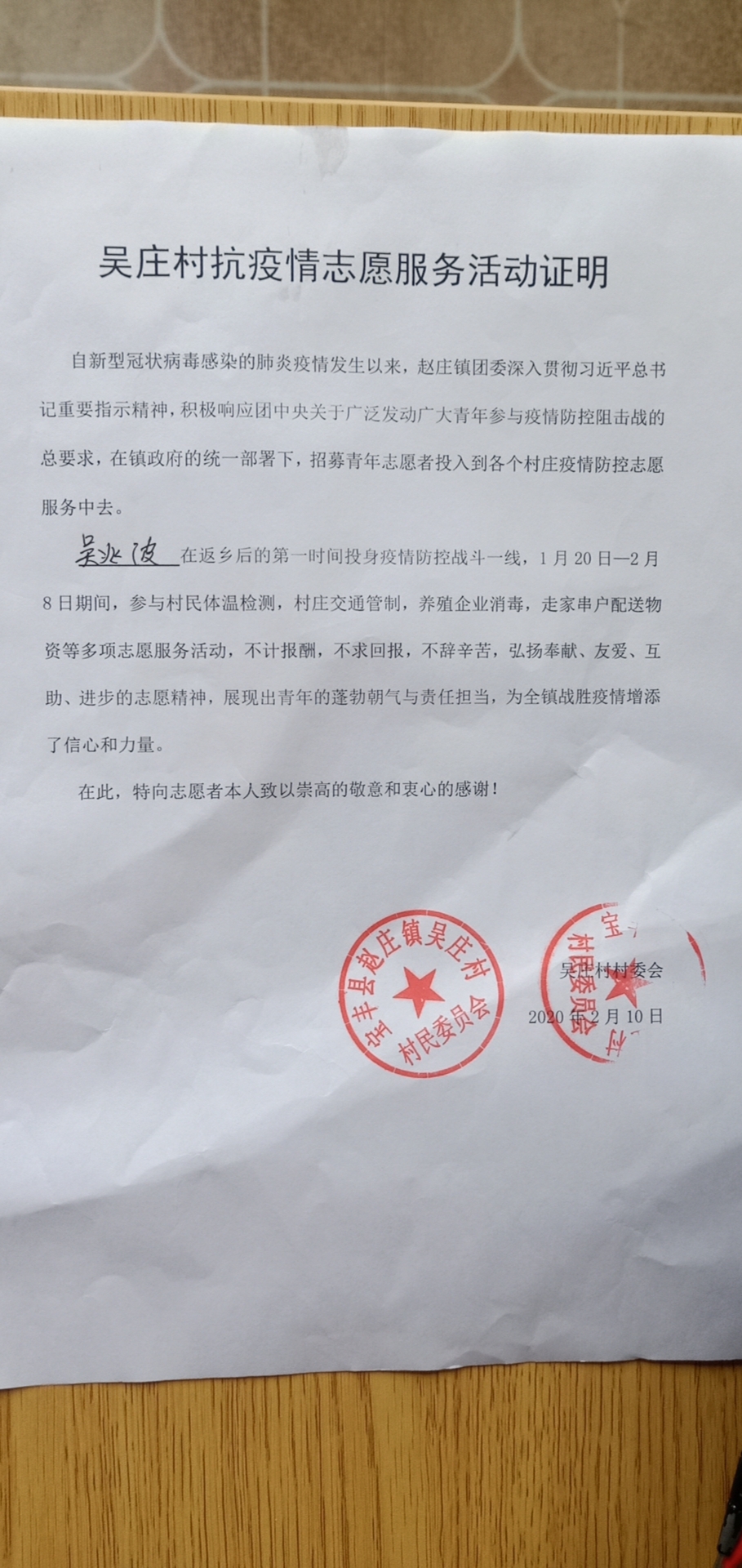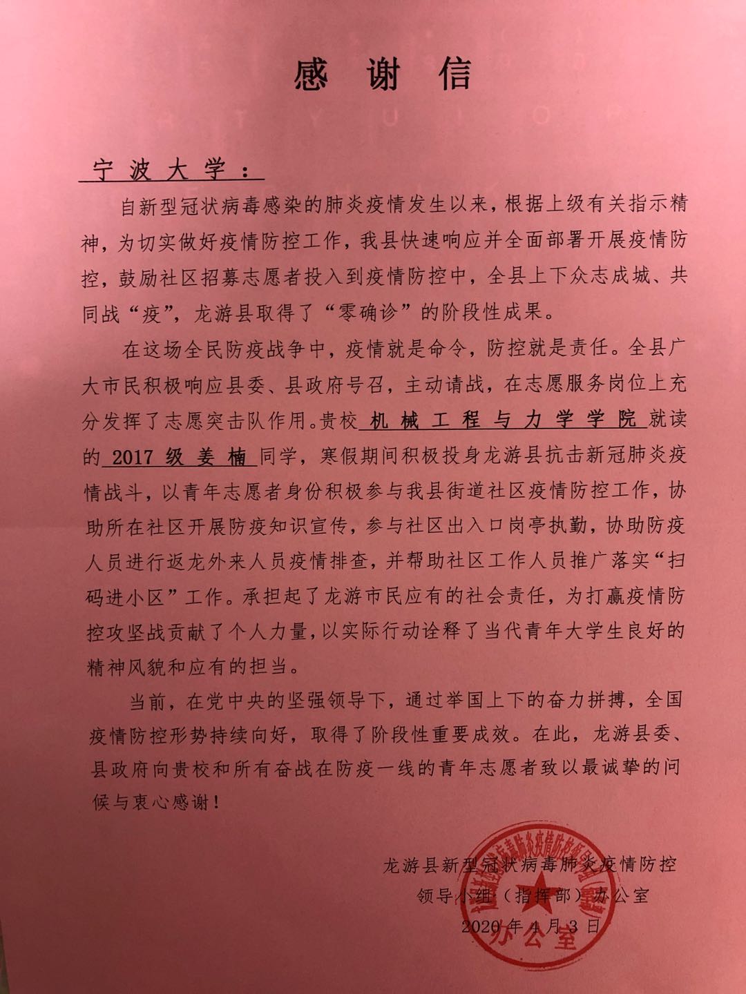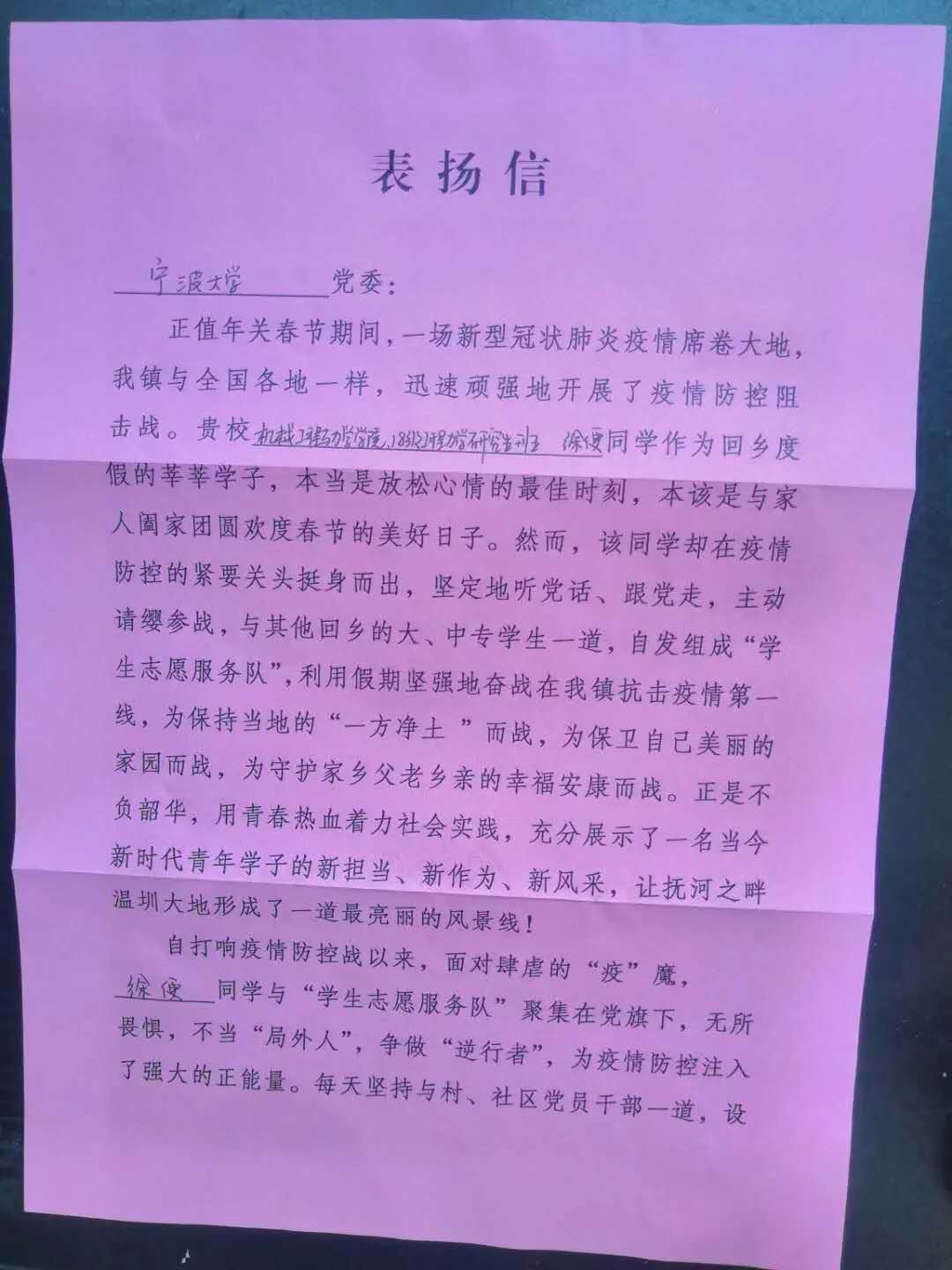 2017工程力学专业本科生姜楠同学在寒假期间,主动加入所在街道社区战“疫”队伍,积极承担防疫知识宣传、社区出入口岗亭执勤和人员排查等工作;河南省平顶山市宝丰县赵庄镇团委,对学院181机械班吴兆波同学返乡期间参与村民体温检测、养殖企业消毒等多项志愿服务活动表示感谢;江西省南昌市进贤县温圳镇委镇政府对学院2018级工程力学研究生班徐便同学予以表扬,赞赏其在疫情防控阻击战中,主动请缨参战,自发组成“学生志愿服务对”,争做“逆行者”;黑龙江省牡丹江市穆棱市兴源镇,则为2018级机械工程专业研究生韩洪民同学点赞,并以“身边的雷锋,我们欠你一个拥抱”为主题,对韩洪民等人的战“疫”事迹进行了介绍。