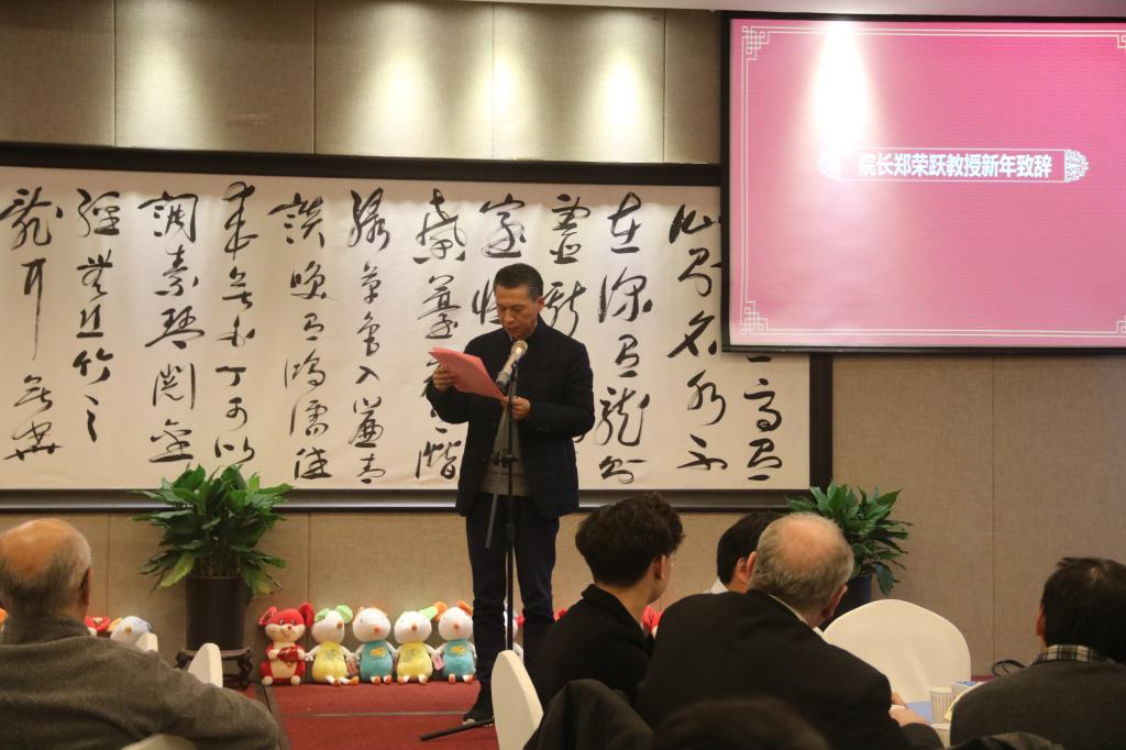 学院院长郑荣跃致新年贺词。他全面回顾了2019年学院在人才培养、队伍建设、学科建设、科学研究、创新创业、学生工作等方面取得的优异成绩,对全体教职员工的辛勤付出表示了诚挚的感谢,希冀大家在新的一年“不忘初心,牢记使命”,团结一致,凝心聚力,攻坚克难,再创新辉煌,用激情与智慧共同谱写学院未来的华彩乐章!