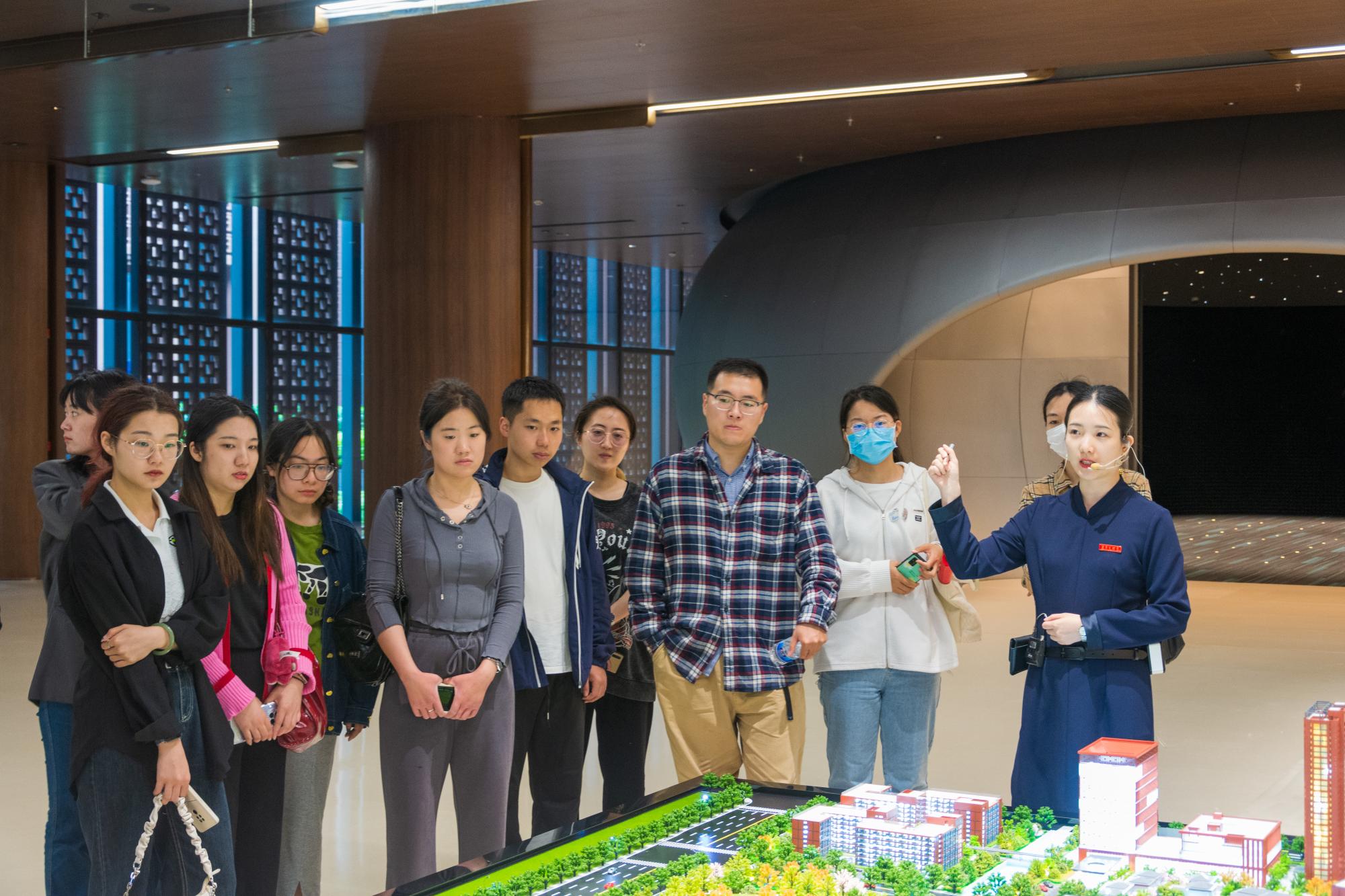 第一站走访方太集团,宁大师生在讲解员的带领下参观企业展厅,首先通过沙盘模型了解企业的建筑布局,其次观看了超大型曲面LED屏播放的企业宣传短片,师生初步了解方太的老王论坛和产品初心,讲解员也随之耐心介绍了方太的发展历程、党建引领工作、专利研发、产品创新事记等一系列内容。之后师生对展览的方太厨卫产品产生浓厚兴趣,纷纷围绕在产品周围进一步了解性能。