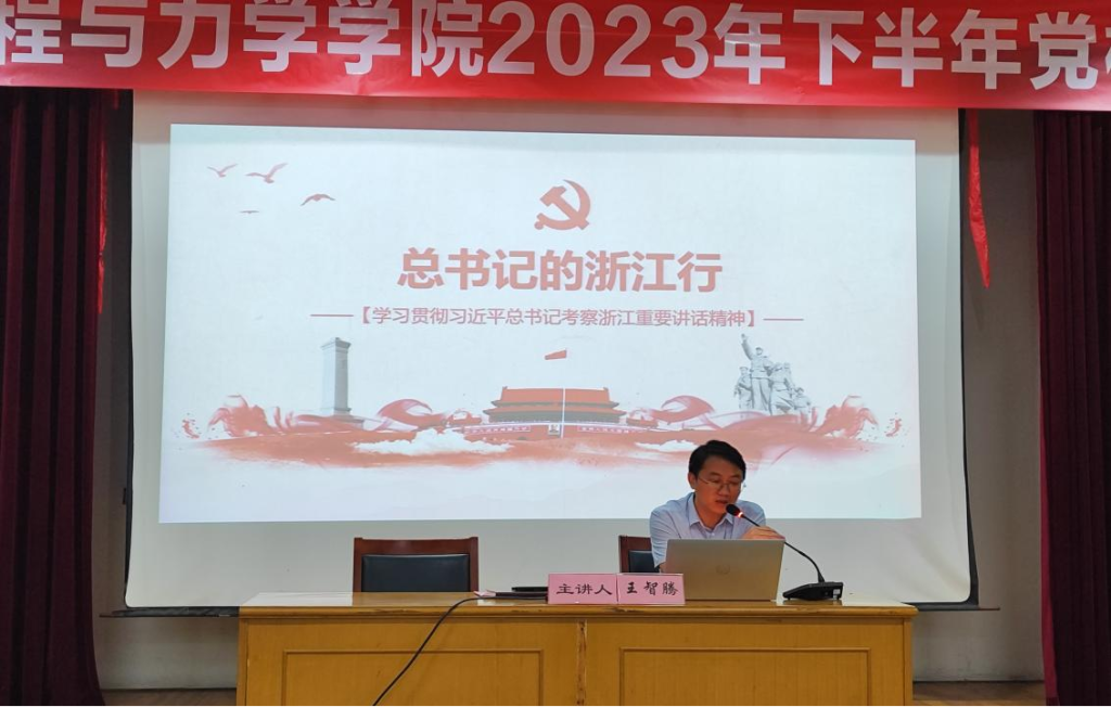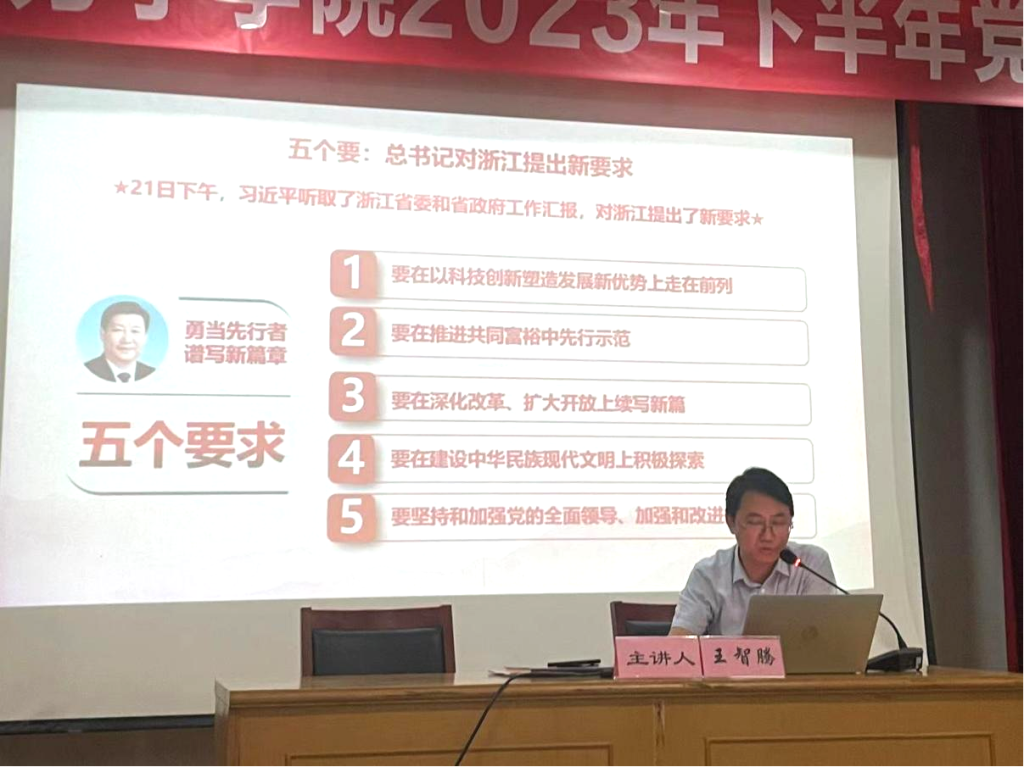 2023年下半年分党校培训第一讲顺利开课,主题为《总书记的浙江行》。入党积极分子、发展对象、预备党员共159名学员全部参加,此次党课由学院党委书记王智腾主讲。