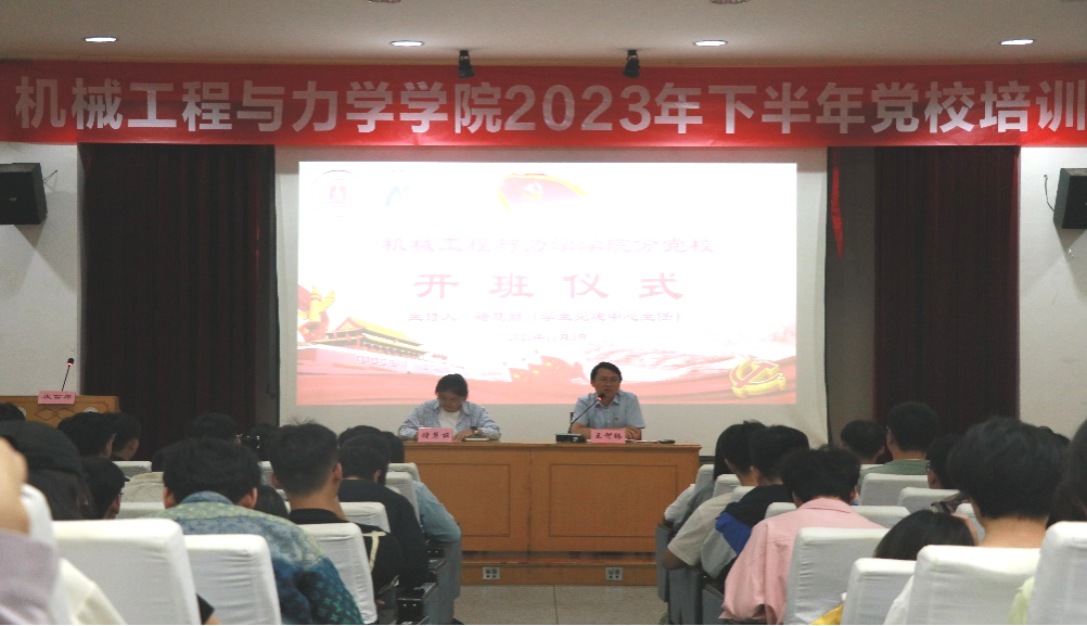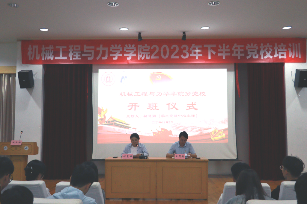 11月3日,机械工程与力学学院2023年下半年分党校在绣山工程楼三楼报告厅顺利开班,各学生党支部书记、学院第29期预备党员培训班、第14期发展对象、第36期积极分子培训班全体学员参加开班仪式。开班仪式由学生党建中心指导老师褚慧丽主持。