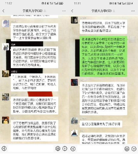 讲座结束后,各班级心理委员还组织同学们在线上线下展开热烈讨论。大家纷纷表示,通过方新博士的分享,他们更深刻地认识到了心理健康的重要性,也充满了应对未来挑战的信心。心理委员们也表示,希望学校今后继续开展各类心理健康教育活动,班级也将继续开展各类同学们喜闻乐见的丰富活动,以帮助班级同学更好地适应大学生活,提高心理健康素养。