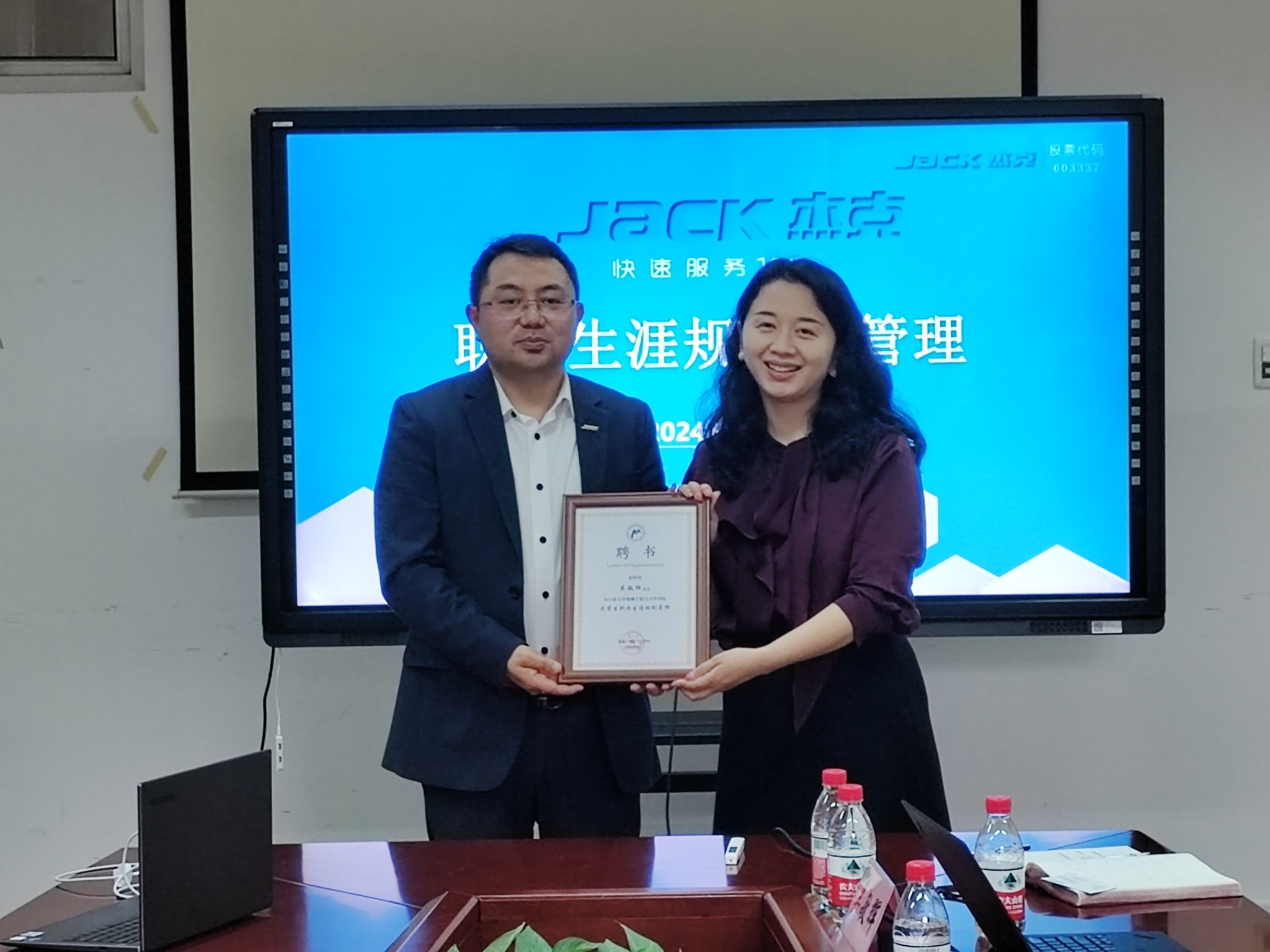 会议上,沈妍伶副书记对吴敏辉总经理一行的到来表示欢迎,详细介绍学院的历史发展情况,专业设置、学生人数规模等,彭文飞副院长围绕研究生教育培养、地方服务开展情况等内容进行阐述,表明与企业在学生实习就业、毕业设计指导和技术研发等方面的合作潜力。吴敏辉总经理对学院的热情接待表达感谢,并介绍了杰克股份的历史概况、发展沿革、业务范围、产业布局和老王论坛等,希冀与学院达成深度全方位的合作,并诚邀学院领导师生莅临企业参观指导。同时,受学院邀请,4月17日上午,吴敏辉总经理还以《职业生涯规划与管理》为题,向学院学生开展职业生涯规划指导讲座,并受聘担任学院职规指导教师。沈妍伶副书记为其颁发聘书。