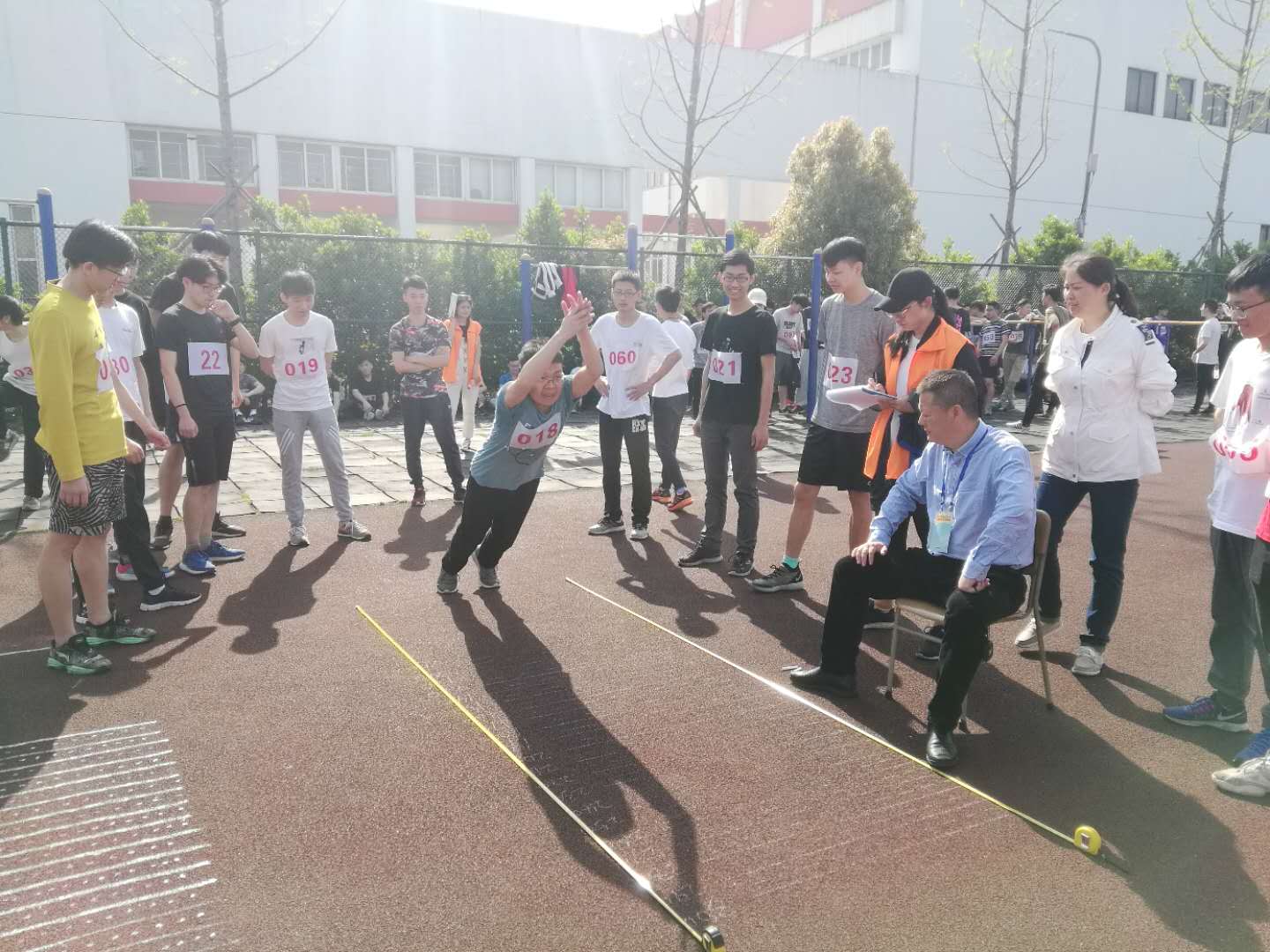 学院高度重视此次抽测活动,给所有参与抽测的140名学生发放三天的晚餐补贴。赛前安排辅导员进行专人督促,并组织各班定时定点组织训练。抽测当天,院党委书记胡泓,副书记邵丽等领导老师,亲临测试现场,看望受测学生,并对学校组织方表示感谢。