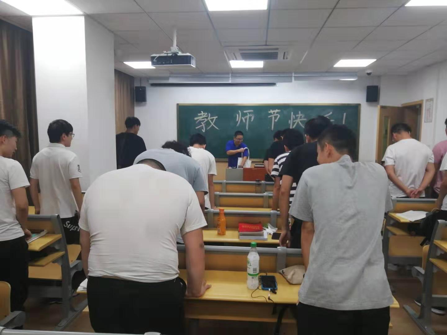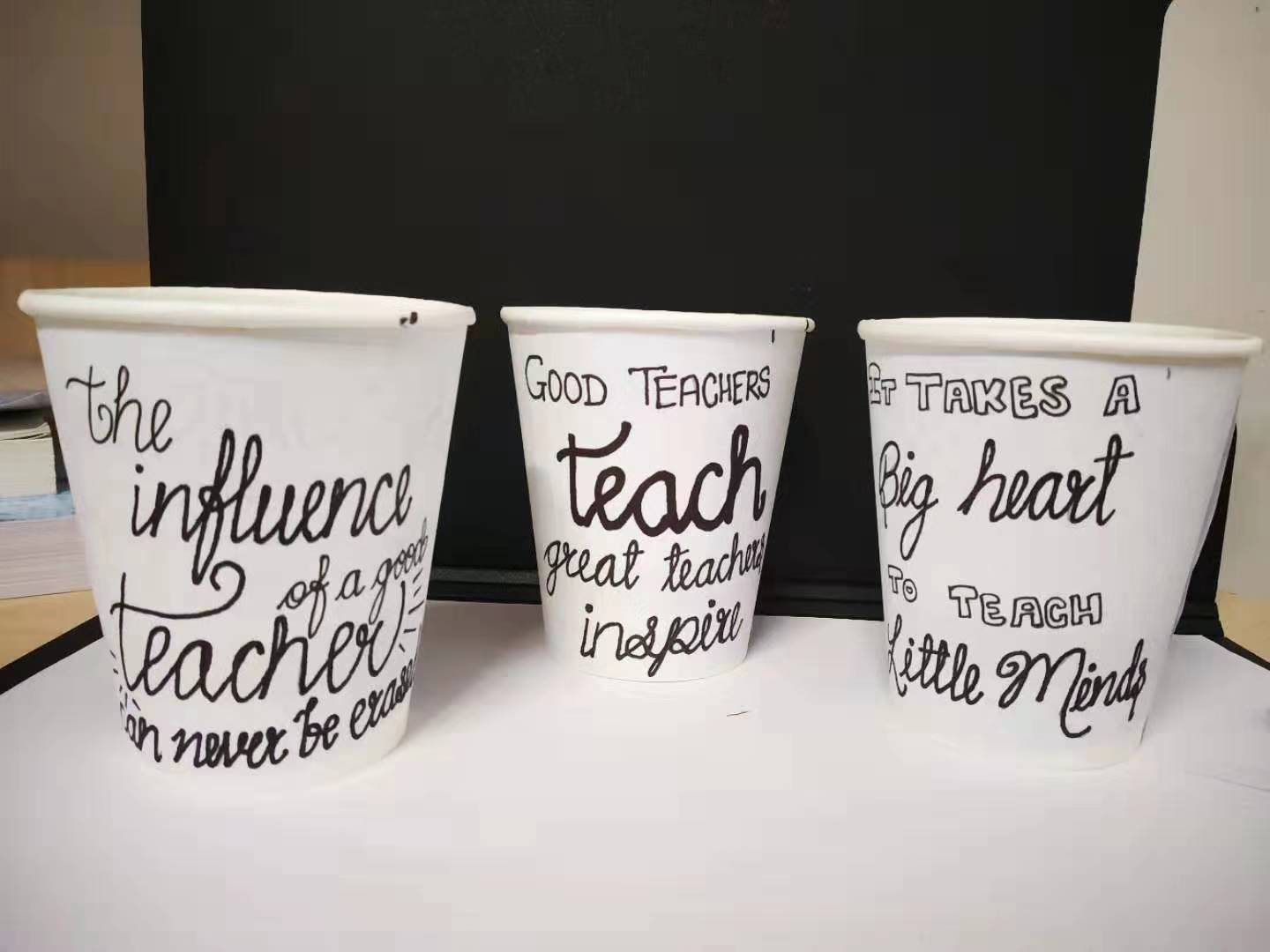 的学生给每一位任课教师递上一杯的茶水,水杯四周被同学们重新彩绘,写满祝福话语和图案,杯底还留有大家的签名。在黑板上写上“教师节快乐”字样的同时,学生们还全体起立为老师齐声道一声谢,深情鞠上一个躬,并留下一张暖意融融的师生合影照。“任教以来,这是我收到的最有意义的教师节礼物”。老师们对同学们的“有心”之举,大加赞赏。