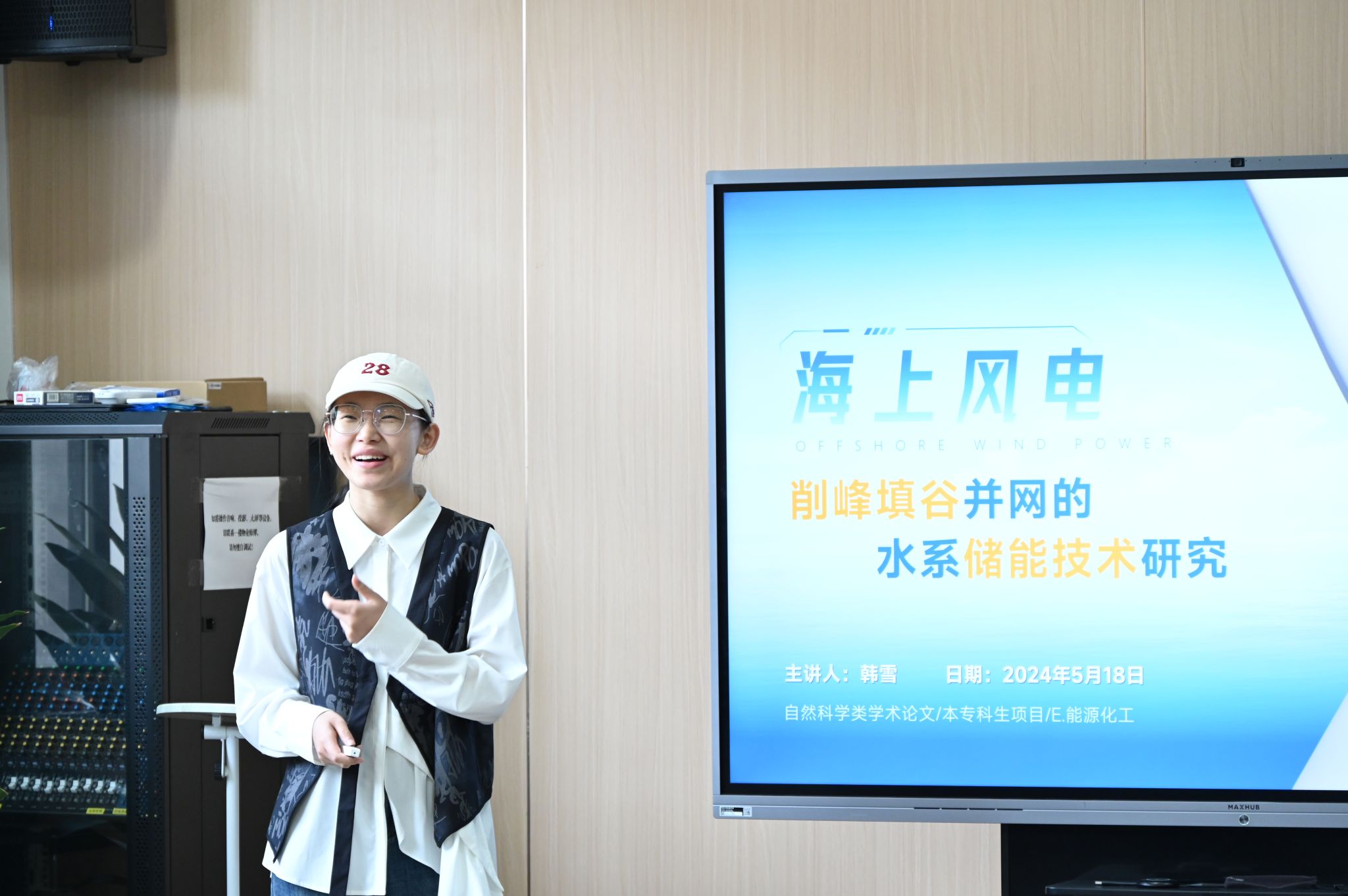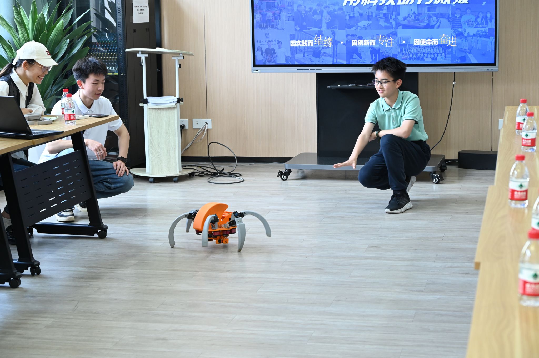2020级化学工程与工艺专业韩雪同学介绍了《海上风电:削峰填谷并网的水系储能技术研究》科研项目,阐述项目成员如何构建适用于盐雾超市环境的储能材料、如何降低储能体系大规模部署成本、如何进一步提升储能体系波动式快充性能等三个问题。2021级机械设计制造及其自动化专业党涛同学重点展示了《蜘蛛侦探——应用于复杂环境救援侦测的滚爬一体式智能机器人的研制》项目,从走访消防中队获得科研灵感到“蜘蛛侦探”4.0的逐步升级研发,并现场邀请同学们体验“蜘蛛侦探”的自动避障功能、自动调平功能、视觉交互功能等,“蜘蛛侦探”在滚动过程中不慎“脚滑”,青藤学子们现场集思广益谈论如何增大“蜘蛛脚”的摩擦力,更有一位同学现场画好了设计简图,为“蜘蛛侦探”的优化提供有益探索。
