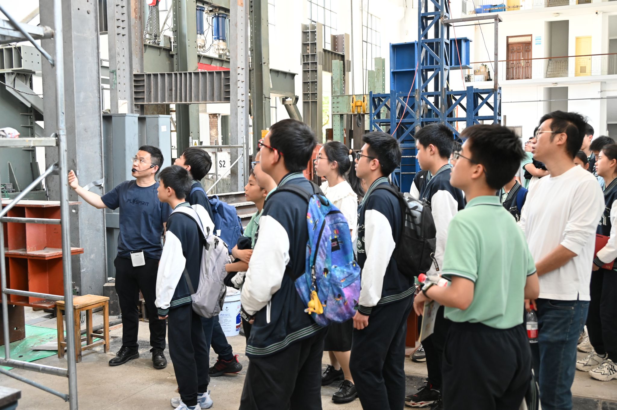 研学第二站便是走访重点实验室。在土木工程与地理环境学院的结构工程实验室,王天宏老师为大家详细讲解建筑结构、桥梁结构及其他结构的动、静态实验测试是如何操作,以及建筑结构在地震时避震的原理。在冲击与安全工程教育部重点实验室,2021级力学专业研究生赵永青同学带领大家从一楼与材料性能相关的仪器到二楼的3D打印、Hopkinson压杆实验室,与“力学”进行了一次近距离的亲密接触。在这里大家充分体验到结构和材料在冲击载荷下的动态力学响应和“创意无限、成就精彩” 的3D打印技术,真实地看到科研人员的工作场景,了解他们攻克科学难题的过程,深刻认识科学技术是怎样改变世界的,也让同学们对科学家多了一份崇敬和向往。