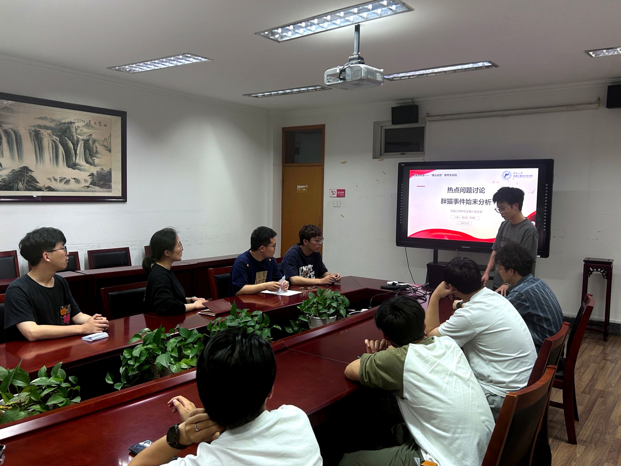 举行时事青年说——“绣山论剑”研究生论坛,论坛主题为“胖猫事件始末分析”,机械工程研究生第六党支部和研会成员共计20余人参与研讨。