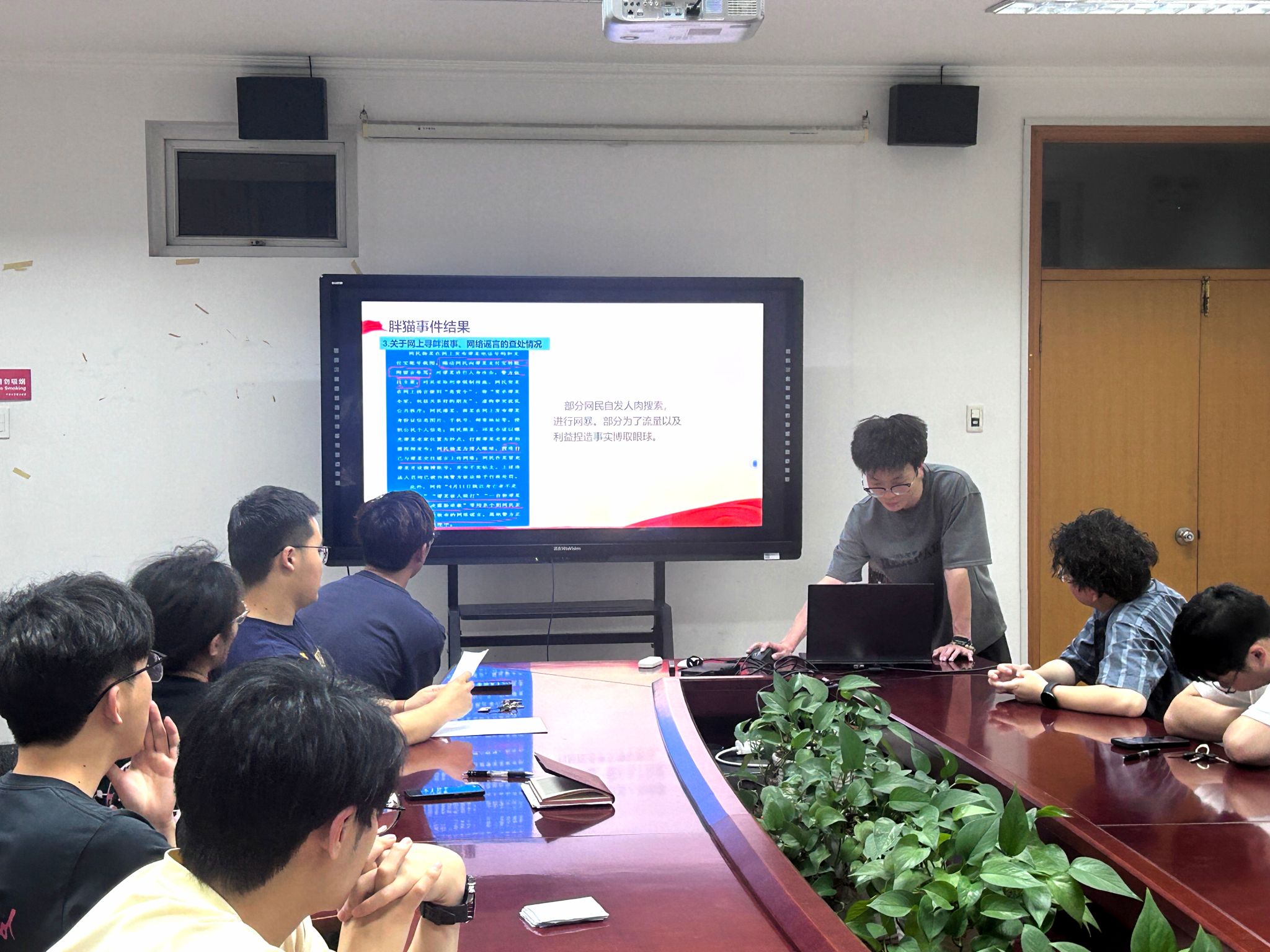之后,在场成员进行“胖猫事件”的主题研讨,田坤鹏同志以警方发布的官方报告为核心,深刻全面地剖析了此次热点事件的来龙去脉。大家纷纷展开讨论,结合自身经历从热点词汇、网络舆论、恋爱观念、法律意识、心理健康等几个维度发表观点,王东伟同学认为不能轻易给别人贴标签,每个人都是很复杂的,不能因为标签就否定一个人的人品或道德水准;王彧同志认为要明白真正健康的恋爱关系很重要,恋爱期间男女双方接收大额转账都应该慎重;翁爽、徐坤、王千杰、谢彪彪等同志认为恋爱应该是男女平等的交往;肖炎彬同志对男主人公的遭遇表达了深切同情,并且希望进一步了解其跳江的真实原因。