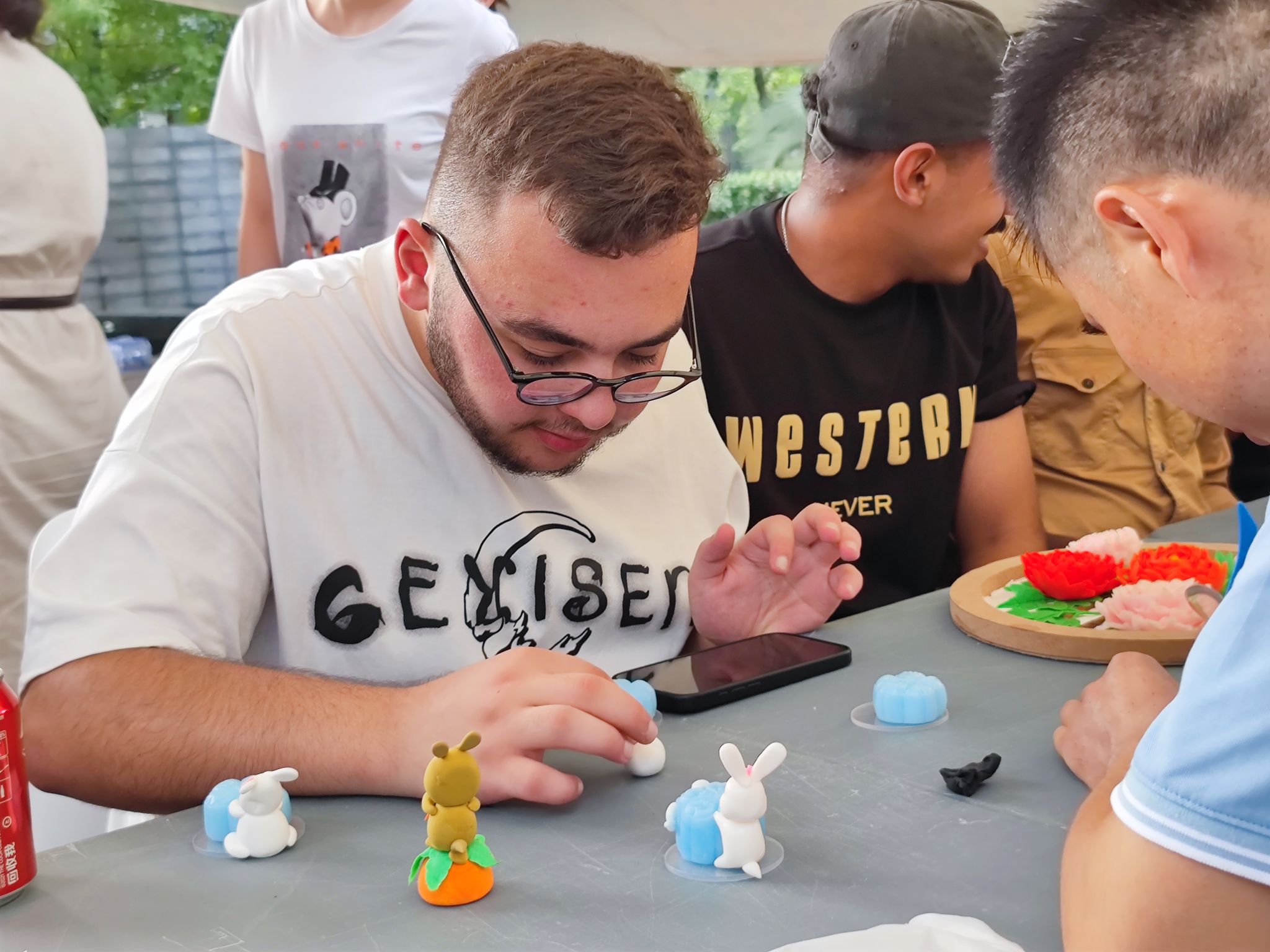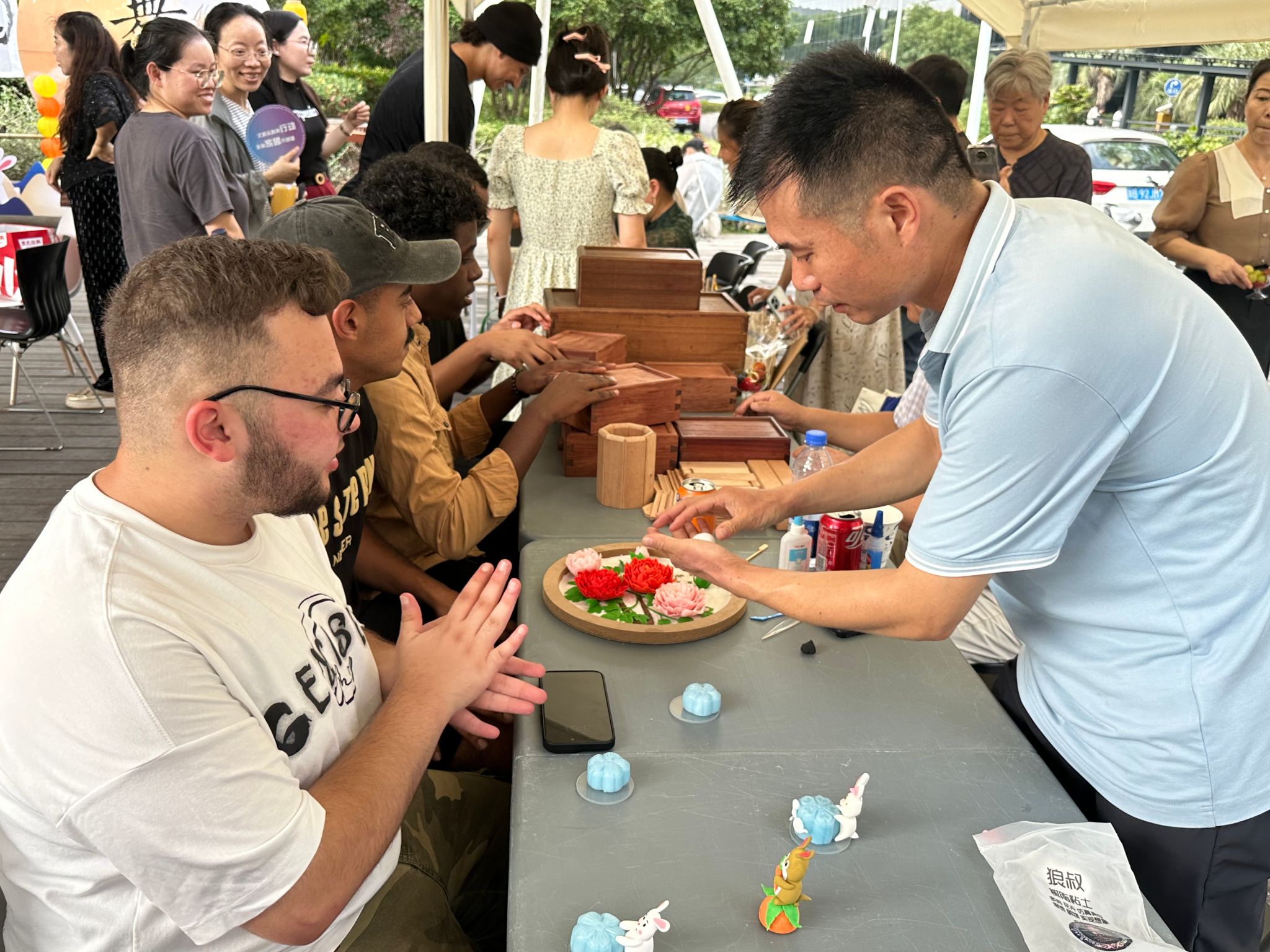 面塑体验区里,在非遗传承人黄铁军老师的示范下,动手揉捏着五彩斑斓的面团,制作出月饼和月兔的组合,虽然作品略显稚嫩,但每一份都蕴含着他们对中国文化的热爱和对技艺的尊重。
