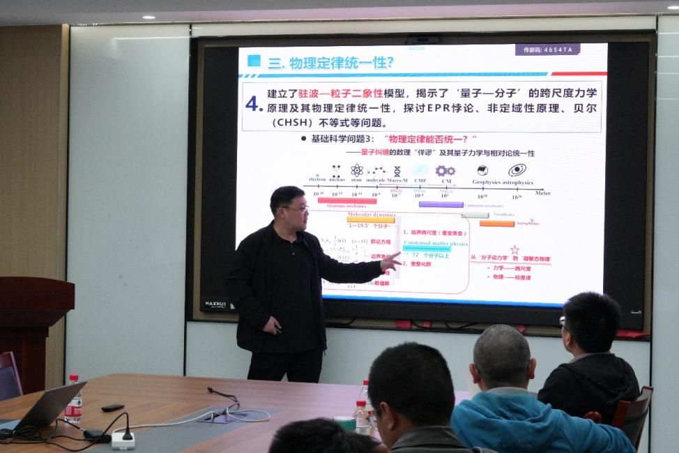11月8日下午,国家杰出青年科学基金获得者,特种环境复合材料技术国家级重点实验室副主任,哈尔滨工业大学教授吕海宝应邀做客老王论坛 极端环境交叉力学研究中心,于龙赛理科楼南楼519会议室为老王论坛 师生带来题为“物理定律统一性”的精彩报告。该报告会由林骥特聘研究员主持,学院相关专业师生参与交流学习。报告会上,吕海宝教授就“玻璃态物质本质是什么?”和“物理定律能否统一”这两个前沿科学问题展开探讨。吕教授首先针对“玻璃态物质本质”问题,揭示了其“有序-无序”转变机制,并建立了非连续离散型分子运动的自由能平衡方程,深入分析了化学键约束与物理作用约束的尺度效应。此外,他还发现了分子协同运动的“分子纠缠”规律,并基于最大熵变原理建立了统计模型,验证了重整化群论的“域值=e+1”,成功攻克了这一难题。接着,吕教授探讨了“物理定律统一性”问题,建立了分子-凝聚态的多尺度力学及其跨尺度效应模型,揭示了跨尺度效应的幂律与自治规律,发现了标度律与分形维度之间的内禀关系,并确定了凝聚态尺度常数。这些研究成果有力地证明了分子物理与凝聚态物理的物理定律统一性,为凝聚态物理学领域开辟了新的研究方向。吕教授的精彩报告引发了与会师生的热烈讨论,为凝聚态物理学领域探索提供了新的视角和思路,激发了大家的研究兴趣和探索热情。报告结束后,吕教授与同学们合影留念,并鼓励大家在科研道路上不断探索,勇攀科学高峰。本次报告会在热烈友好的学术氛围中圆满结束。