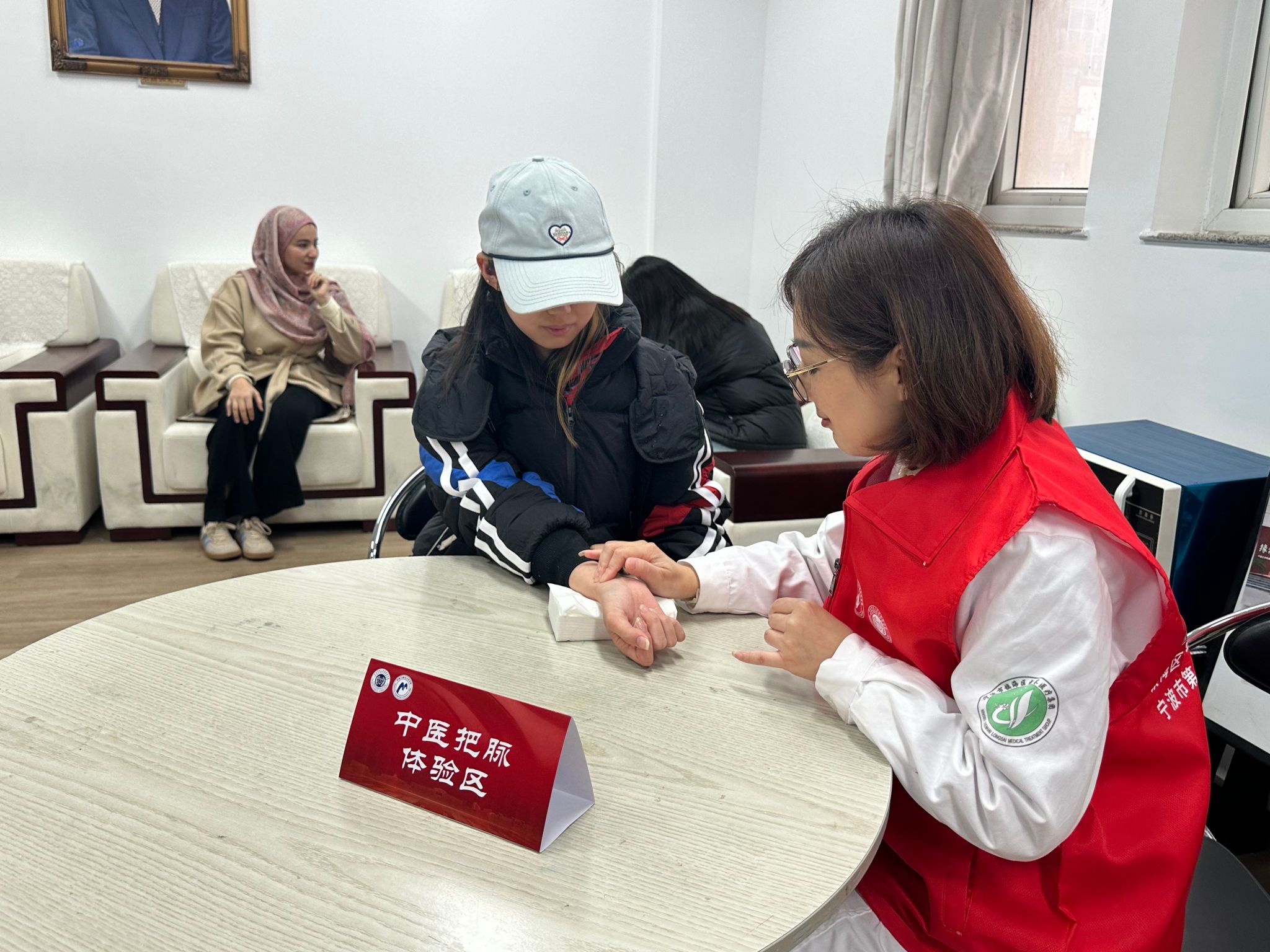 活动现场被精心划分为两个分会场:传统疗法体验区和中医文化互动区。在传统疗法体验区,设置了“针灸体验区”“耳穴体验区”“穴位贴敷体验区”和“耳部刮痧体验区”。中医医师们逐一为同学们带去针灸的微妙、耳穴的神奇、穴位贴敷的舒适以及耳部刮痧的放松。他们细致入微的手法,让同学们感受到了中医传统疗法的独特魅力。在“中医把脉体验区”,医师们通过精准的脉象诊断,为同学们解读身体状况,并提供了个性化的健康建议。学生们纷纷表示,这些体验让他们对中医有了更直观、更深入的了解,对中医的智慧深感敬佩。在中医文化互动区,“中药香囊制作”和“中药临方炮制产品”两个环节同样吸引了大量同学参与。在医师们的指导下,同学们亲手制作香囊,了解中药炮制的过程,体验到了中药文化的独特韵味。此外,“八段锦带练体验区”更是热闹非凡,同学们在医师的带领下,认真学习每一个动作,感受中医养生运动的魅力。大家纷纷表示,这样的活动不仅让他们学到了中医知识,还让他们在忙碌的学习生活中找到了放松身心的方式。中医的文化魅力还吸引了不少留学生前来体验,留学生们对于穴位和体部位的映射感到好奇,对中医文化的敬佩之情油然而生。