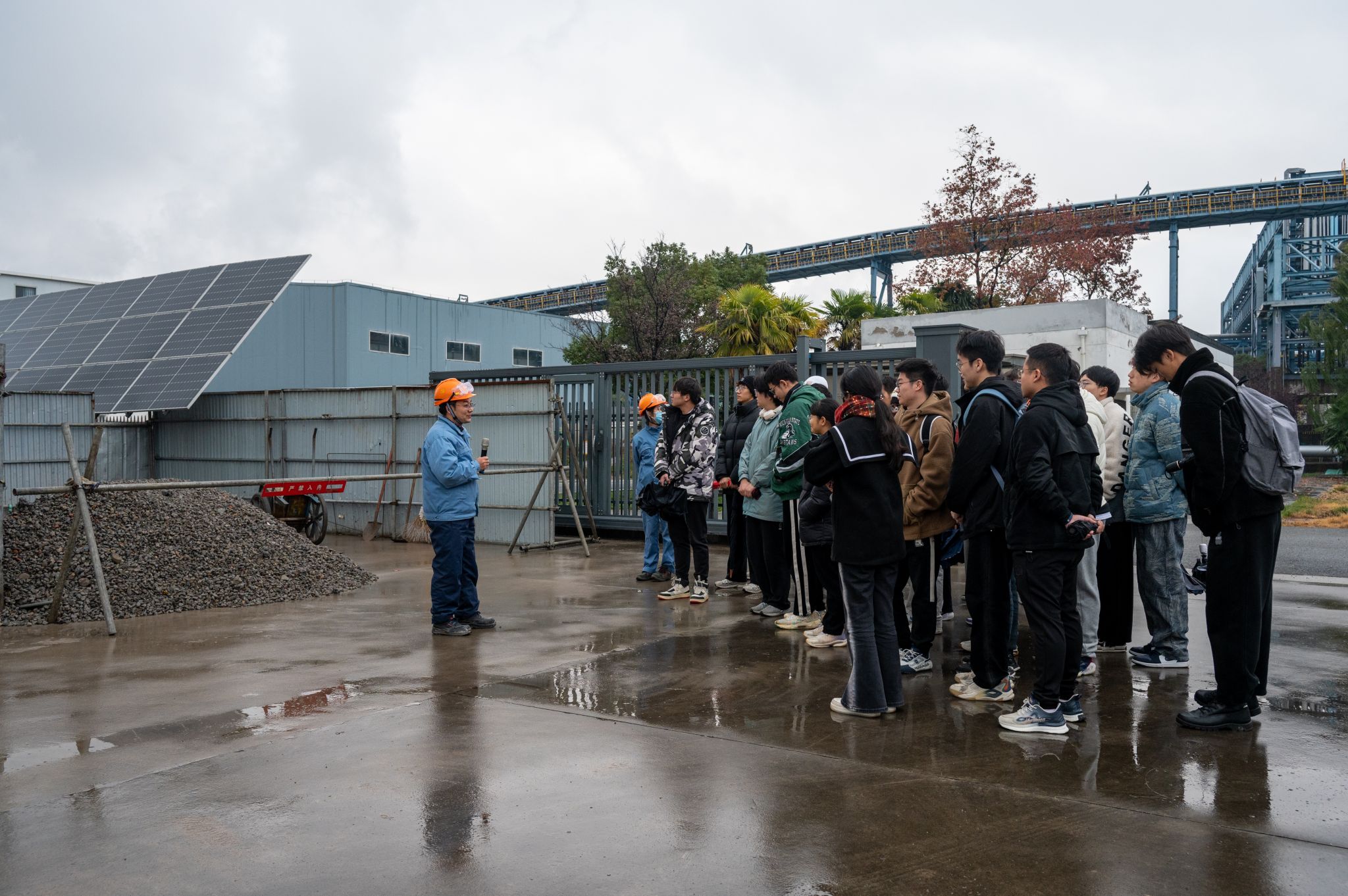 活动伊始,参观团队抵达镇海炼化外配电箱处,映入眼帘的是三块大面积的太阳能光伏板。这些光伏板不仅是镇海炼化绿色转型的生动实例,更是学生党员们学习的生动课堂。讲解人员详细介绍了光伏板的工作原理及其在炼化过程中的环保价值,让学生们深刻感受到绿色能源的魅力。光伏板的有效利用,不仅减少了对传统能源的依赖,还降低了炼化过程中的碳排放量,体现了绿色转型的显著成效。