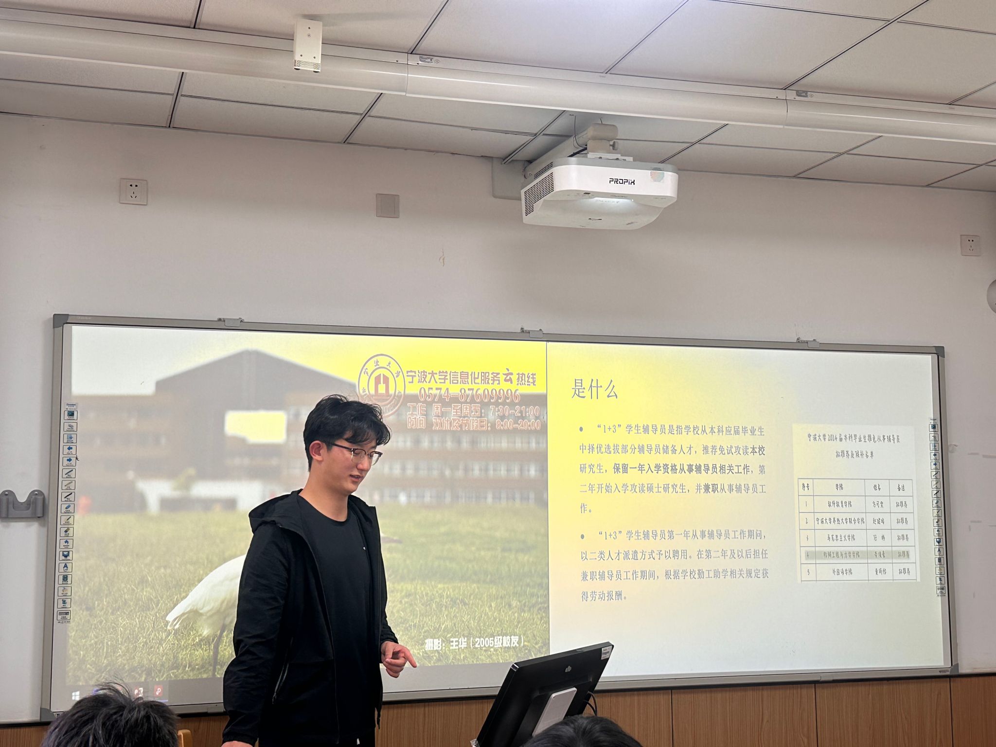 通过“1+3”学生辅导员推荐上岸本校的李俊豪学长结合自身经历讲解了“1+3”政策、报考流程、思考与展望等,为学弟学妹们带来了全面而实用的经验分享。他指出这一政策不仅为优秀学生提供了免试攻读本校研究生的宝贵机会,还能让学生提前融入科研团队,获得导师一对一指导。随后,李学长详细梳理了报考流程,从材料准备、学院推荐到最终考核,同时建议大家关注重要时间节点、调整好心态,鼓励大家平衡课程学习与工作。