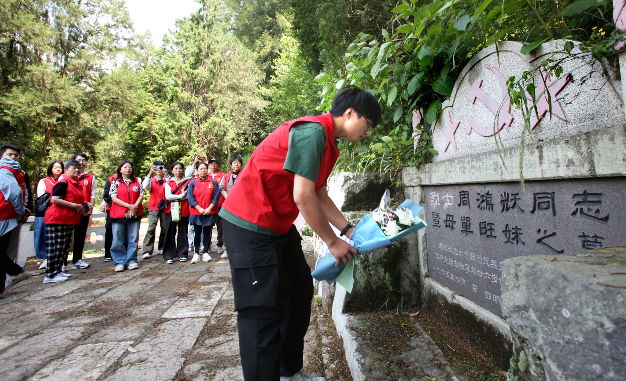 随后,在场志愿者前往三烈士墓,敬献鲜花。讲解员向我们介绍了烈士革命背后的故事,比如周鸿耀烈士牺牲后(年仅25岁),他的母亲每年都会给前来缅怀的小朋友一人准备两颗大白兔奶糖,用来感谢大家还记着他的儿子,母亲去世后,和儿子合葬至一处。在场志愿者无不动容。