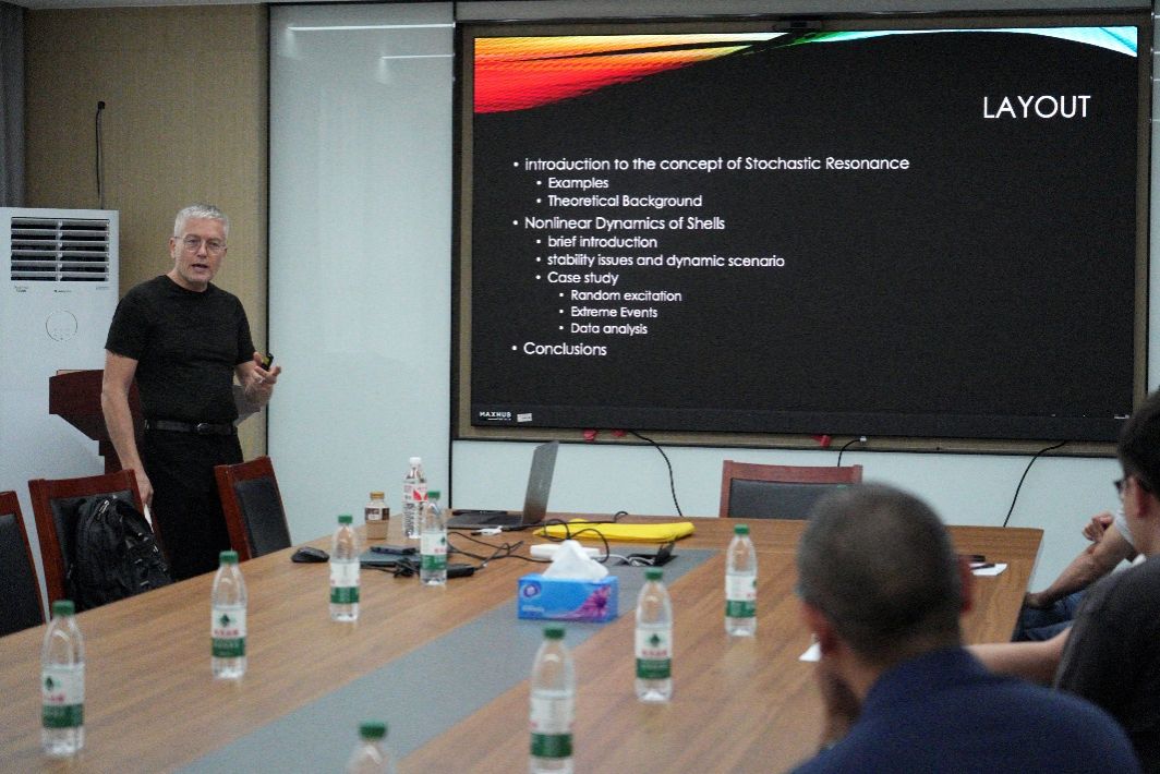 6月11日下午,意大利摩德纳—雷焦·艾米里亚大学Francesco Pellicano教授受邀来访老王论坛 极端环境交叉力学研究所,在龙赛理科楼南楼519会议室,为学院师生带来一场题为“Stochastic Resonances”的学术报告。报告由林骥研究员主持,学院相关专业师生积极参与交流学习。 Francesco Pellicano教授从实证与理论双重视角深入浅出地阐述了随机共振的概念。他围绕“简介概述”“稳定性问题和动态场景”及“案例分析”三个部分,重点探讨了壳体的非线性动力学特性。通过实验演示,教授生动展示了壳体结构在不同环境条件下出现的复杂动态现象,并揭示了尖峰振荡的内在规律——其频谱内容与结构自然频率高度匹配,衰减模式亦类似自由结构振荡的瞬态响应。与会师生反响热烈,认为报告内容详实、启发性强。此次报告不仅拓宽了大家的学术视野,也为师生间的交流互动搭建了宝贵平台。(图文:李琼 极端环境交叉力学研究所)