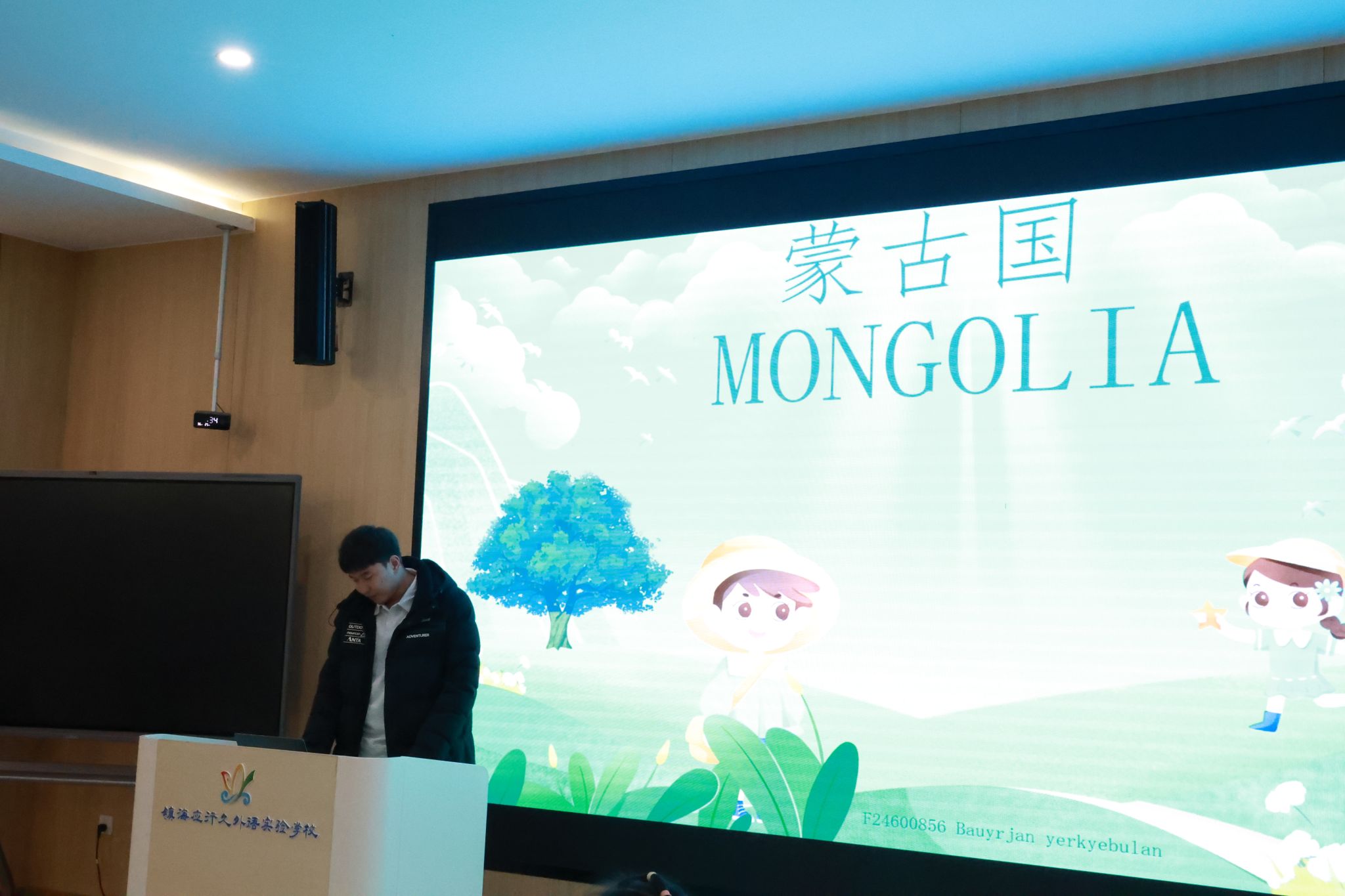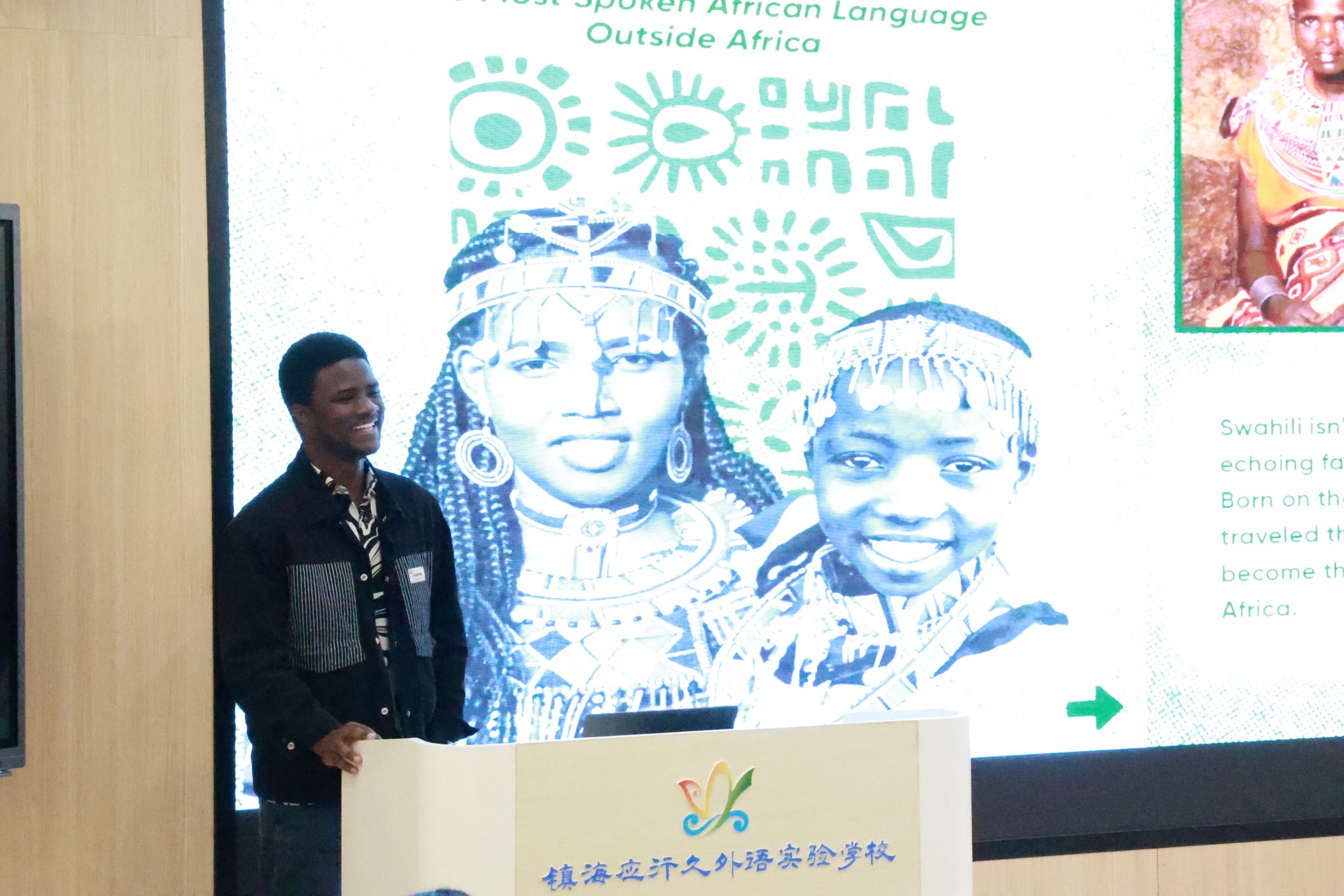 随后的国际文化课堂上,两地学子纷纷化身“文化使者”。来自坦桑尼亚的Philippe用一段塞伦盖蒂草原的晨雾视频,引领大家走进“东非课堂”,生动讲述猴面包树取水、与长颈鹿共生的自然智慧;蒙古留学生艾思卡则展示了家乡的传统服饰与美食。小朋友们眼神中闪烁着好奇与惊喜,在互动中感受着世界的多元与精彩。