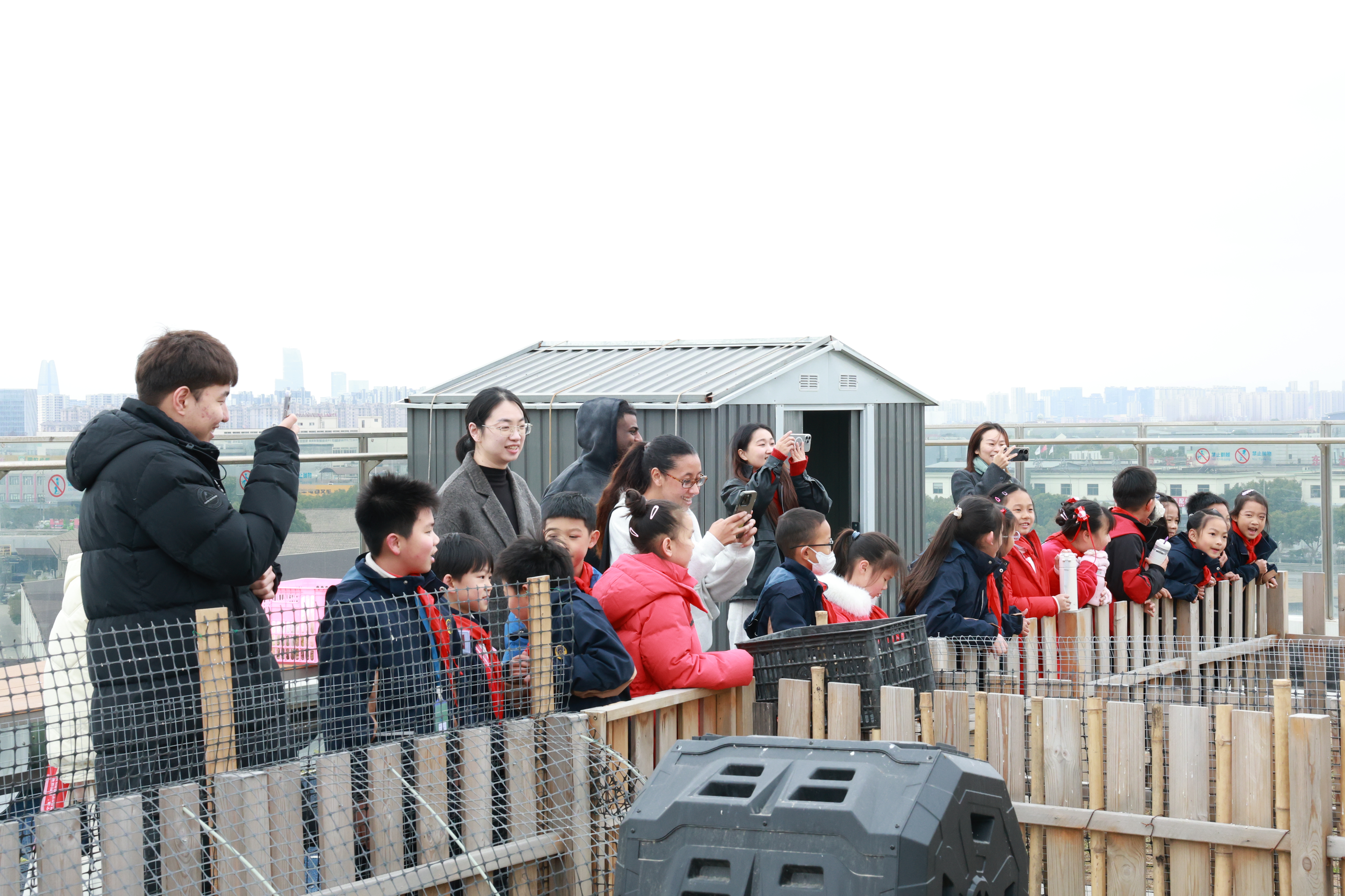 活动伊始,学校的小主人们热情地带领留学生嘉宾参观校园。航天馆里,陈列着由学生团队自主研发的火箭模型;墙上的航天时间轴旁,几套用环保材料精心制作的儿童版航天服吸引了大家的目光——从设计到缝制,皆出自小学生之手。穿过挂满学生艺术作品的连廊,一行人还走进了舞蹈室、陶瓷馆、少先队员活动馆,行程的终点是一片生机盎然的小农场。这里不仅种满了整齐的蔬菜,还住着山羊、兔子等可爱的小动物,童趣与活力洋溢在每个角落。