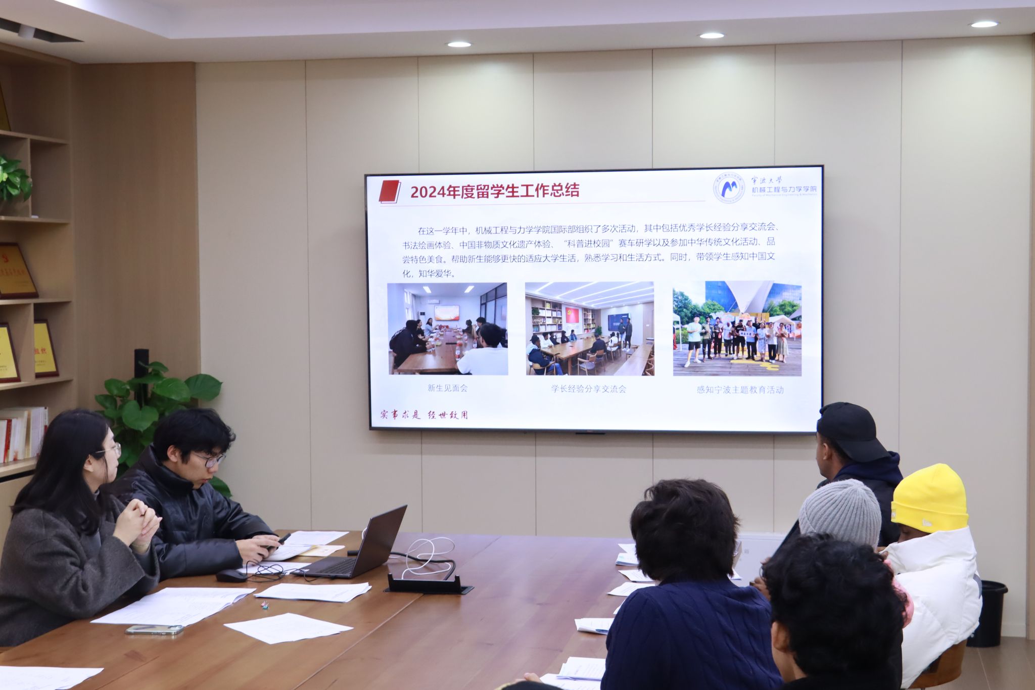 会议伊始,助理辅导员王顺顺进行了2024学年年度工作总结。截止目前,学院共有27位国际学生,学年共组织中外学生联动活动20余次,并完成第四届MEMISU换届工作。